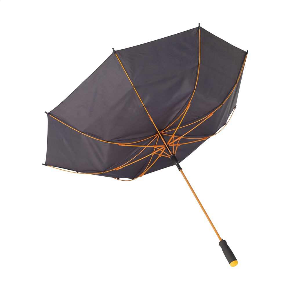 Sturmregenschirm mit automatischer Teleskopöffnung, 190T Polyester-Bespannung, metallenem Stahl- und Kunststoffrahmen, vorgeformten Schaumgriff und Klettverschluss. In einem nützlichen Trageetui mit Schulterriemen.