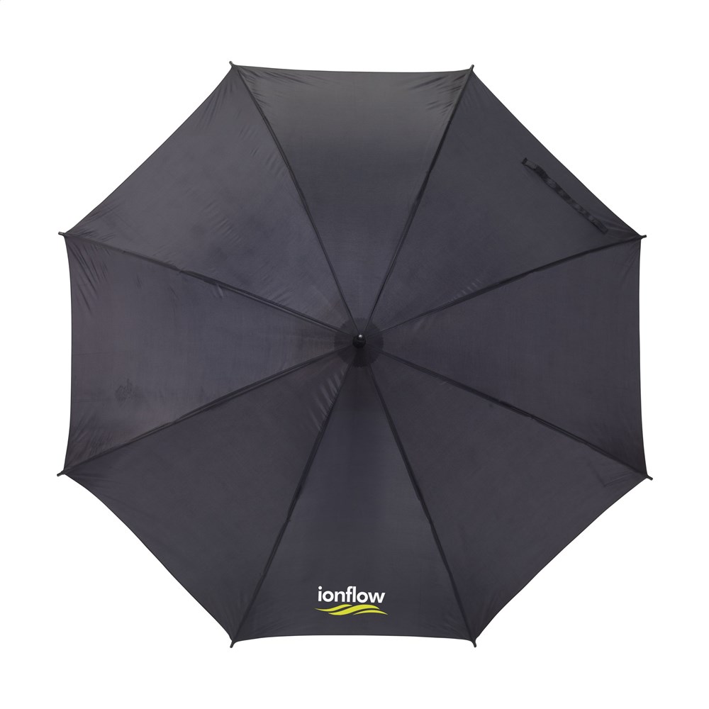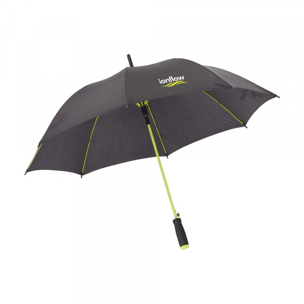 Sturmregenschirm mit automatischer Teleskopöffnung, 190T Polyester-Bespannung, metallenem Stahl- und Kunststoffrahmen, vorgeformten Schaumgriff und Klettverschluss. In einem nützlichen Trageetui mit Schulterriemen.