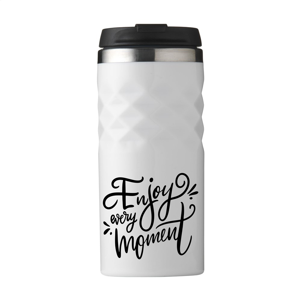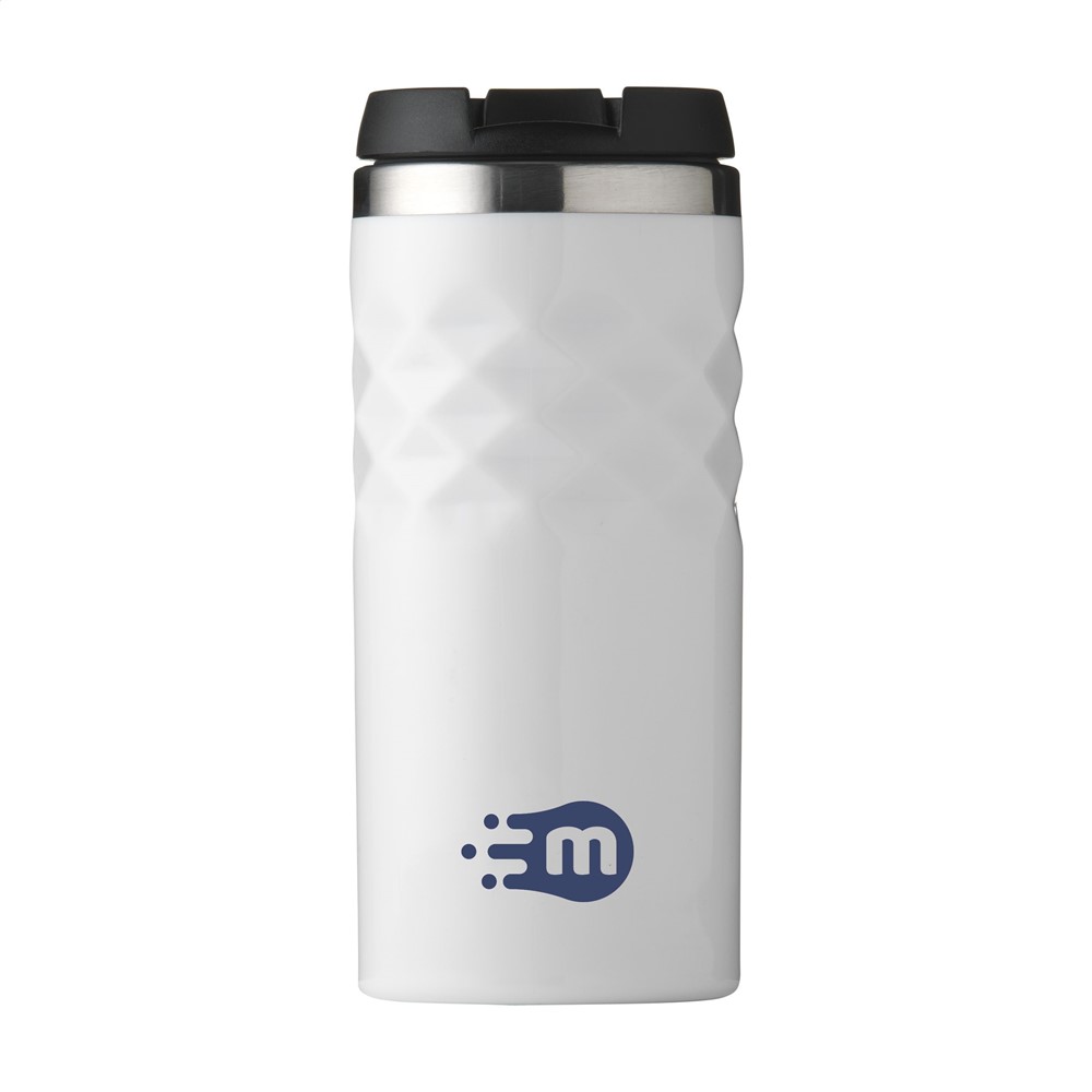 Doppelwandiger, auslaufsicherer Thermobecher aus Kunststoff mit Edelstahlinnenwand, Schraubverschluss und Klicköffnung. Mit auffallendem geometrischem 3D-Rautenmuster im Halter. Rutschfester Boden. Fassungsvermögen: 280 ml. Pro Stück in einer Verpackung.