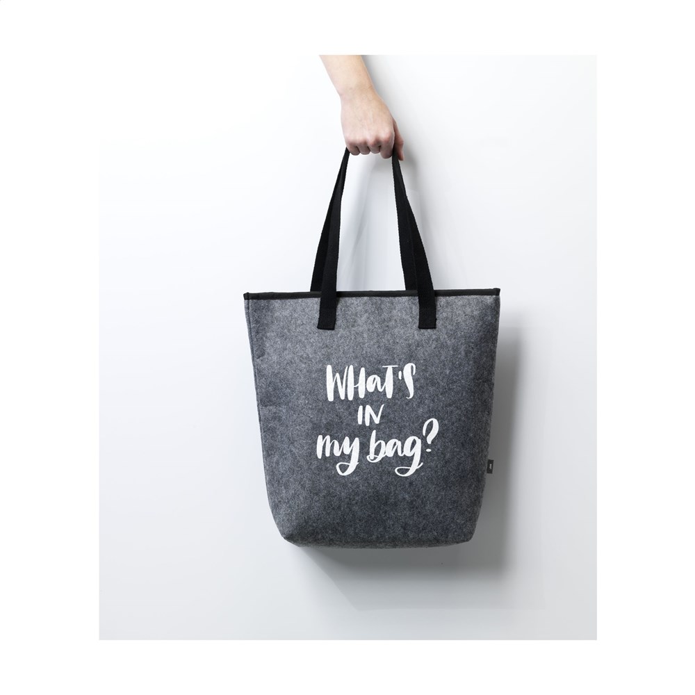 Großzügige Kühltasche aus RPET Filz (hergestellt aus recycelten PET-Flaschen). Mit isolierendem Aluminium-Innenraum. Dieser Shopper hat einen praktischen Klettverschluss und Trageschlaufen. Sehr gut geeignet für den Transport von Tiefkühlprodukten.