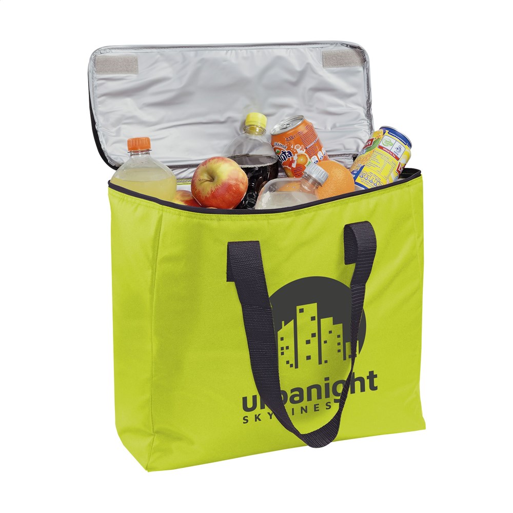 Große, robuste Kühltasche aus 600D-Polyester mit Reißverschluss und Tragegriffen. Diese Tasche bietet viel Stauraum und kann bis zu acht 1,5-Liter-Flaschen fassen. Diese Tasche kann auch zum Transportieren von Zwei-Liter-Flaschen verwendet werden.