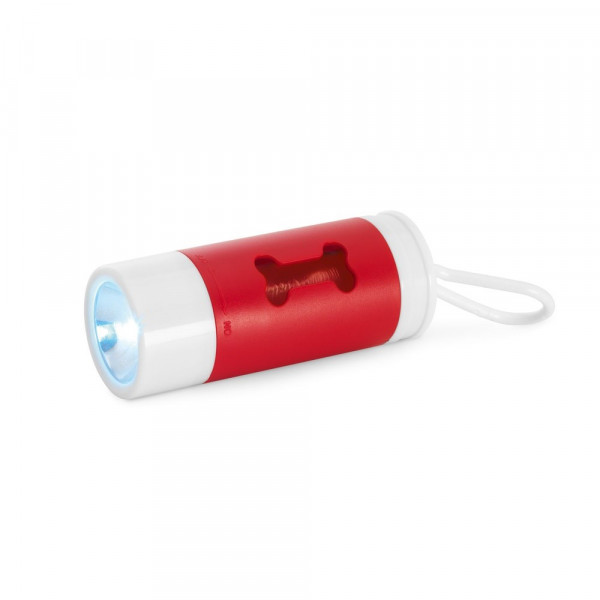 Hundetütenbehälter aus ABS mit LED-Licht, Karabiner und 20 Beuteln. Inklusive 3 LR1130 Batterien. Tütenhalter: ø40 x 100 mm | Plastiktüten: 265 x 310 mm