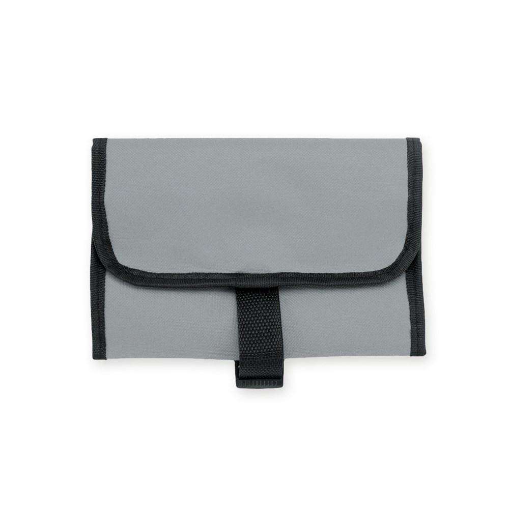 Praktischer Kulturbeutel mit Haken zum Aufhängen aus strapazierfähigem 600D Polyester in kräftigen Farben mit schwarzer Paspel. Außentasche mit Reißverschluss und verstellbarem Riemen mit Klickverschluss. Weiches Polyester-Innenfutter mit verschiedenen Taschen und Netzfach.