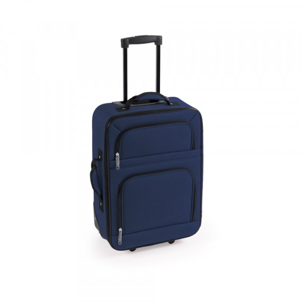Trolley mit 2 Rollen aus robustem 600D Polyester mit fröhlichem zweifarbigem Design. Reißverschluss-Hauptfach mit zwei Zippern mit Löchern für die Anbringung eines Vorhängeschlosses. Zudem mit zwei Außentaschen mit Reißverschluss, zwei Tragegriffen mit Polsterung sowie einem verstärktem Boden mit stabilen Standbeinen und farblich passenden Rollen. Im Inneren mit zwei separaten Fächern mit verschiedenen Taschen und Spanngurten zur Befestigung.