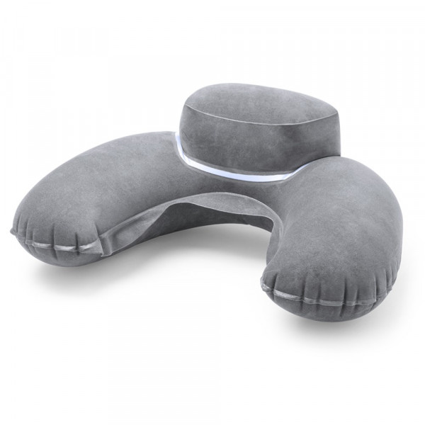 Aufblasbares Nackenkissen mit Kopfstütze aus weichem Wildleder mit lebhaftem zweifarbigem Design. Präsentiert in einer farblich passenden Wildleder-Hülle.