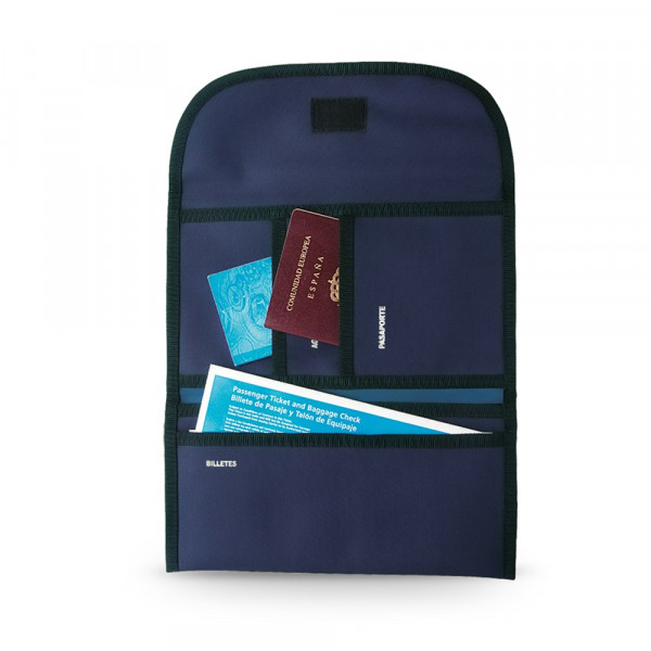 Reisedokumentenhülle aus robustem 600D Polyester in lebendigen Farben mit Paspelierung. Mit Klettverschluss, verschiedenen Fächern im Inneren und Schlaufe für die Befestigung am Gürtel auf der Rückseite.