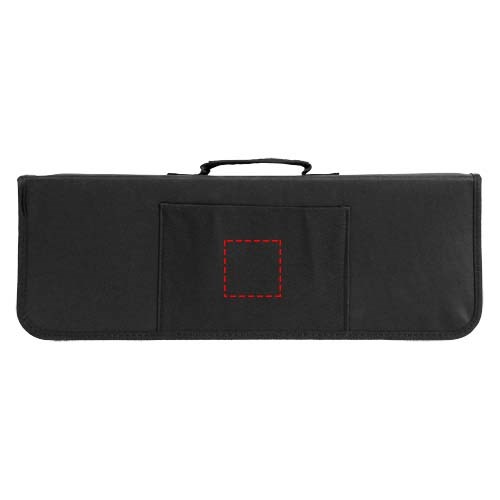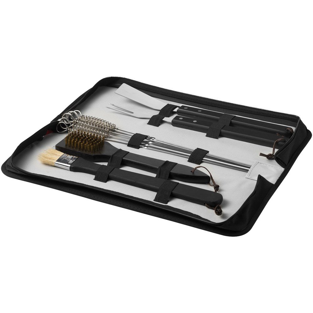 Grillset mit Pfannenwender, Pinsel, Gabel und Reinigungsbürste (alles mit Holzgriffen), sechs Spießen und Tragetasche mit Reißverschluss mit Vordertasche, die problemlos dekoriert werden kann.