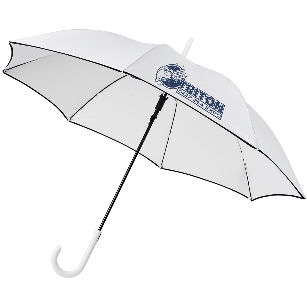 Automatikregenschirm mit einem Polyesterschirm aus Pongee in frischen Farben. Robuster Metallschaft und ein hochwertiger Vollglasfaserrahmen mit maximaler Flexibilität bei Wind. Der gebogene Griff hat einen integrierten Druckknopf. Farbige Details sind im Inneren des Glasfaserrahmens erhältlich und diese ziehen sich durch den Griff, die Spitzen und die obere Kappe. Große Dekorationsfläche auf jedem Paneel verfügbar.