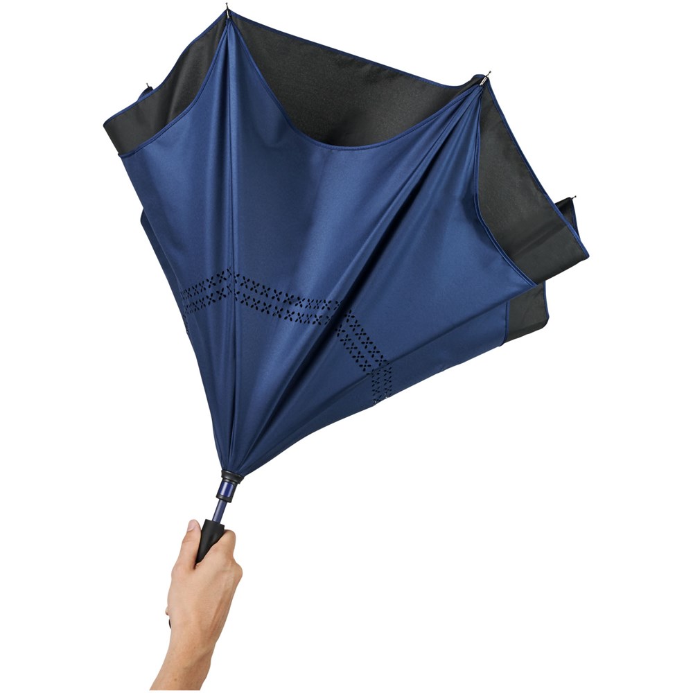 23 Zoll zusammenklappbarer Wende-Regenschirm in frischen Farben. Öffnet und schließt „verkehrt herum“, dies macht es einfacher, ihn beim Ein- und Aussteigen in ein Auto zu verwenden, da das Wasser innen und die äußere Oberfläche trocken bleibt. Der Regenschirm kann alleine stehen, wenn er geschlossen ist, sodass das Wasser zum Trocknen ablaufen kann. Windfestes Gestell mit Fiberglas-Speichen und Schaft. Manuelle Öffnung mit einem Druckknopf, einklemmsicherer Schieber und doppellagige Polyester-Plane. Die innere Haube und die Paspelierung auf der äußeren Haube sind farblich abgestimmt, sowohl mit dem Glasfaserschaft als auch mit dem Druckknopf. Große Dekorationsfläche auf jedem Paneel verfügbar.