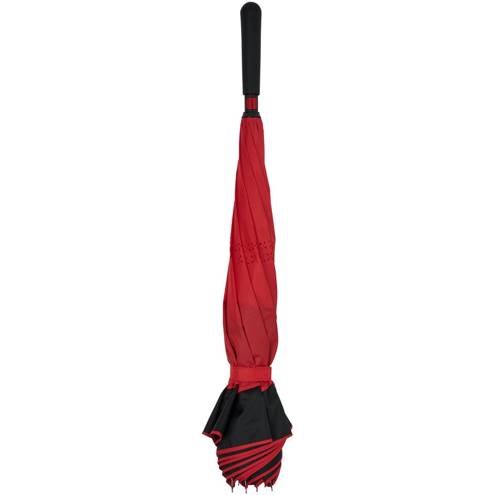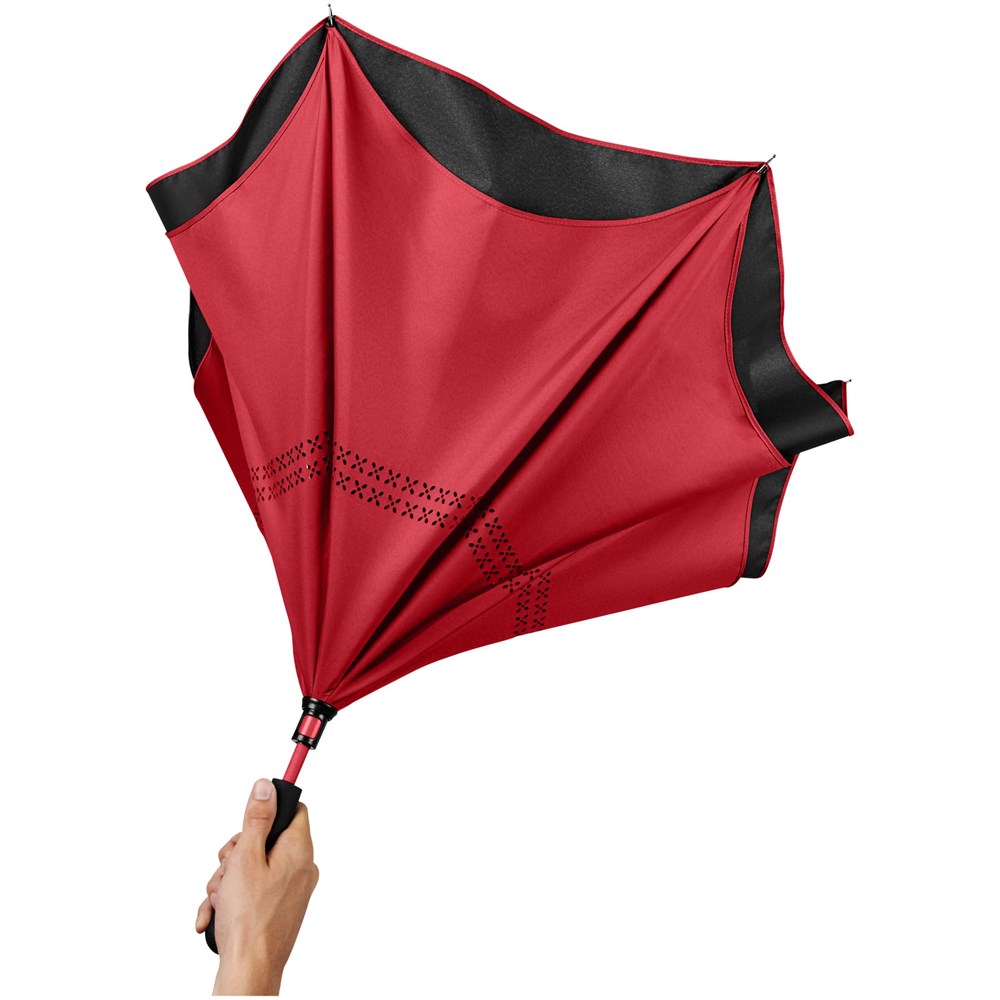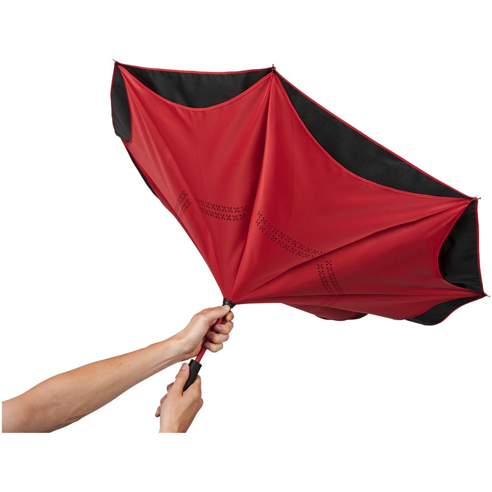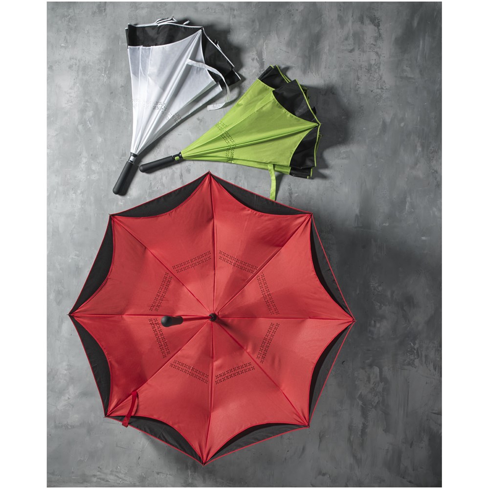 23 Zoll zusammenklappbarer Wende-Regenschirm in frischen Farben. Öffnet und schließt „verkehrt herum“, dies macht es einfacher, ihn beim Ein- und Aussteigen in ein Auto zu verwenden, da das Wasser innen und die äußere Oberfläche trocken bleibt. Der Regenschirm kann alleine stehen, wenn er geschlossen ist, sodass das Wasser zum Trocknen ablaufen kann. Windfestes Gestell mit Fiberglas-Speichen und Schaft. Manuelle Öffnung mit einem Druckknopf, einklemmsicherer Schieber und doppellagige Polyester-Plane. Die innere Haube und die Paspelierung auf der äußeren Haube sind farblich abgestimmt, sowohl mit dem Glasfaserschaft als auch mit dem Druckknopf. Große Dekorationsfläche auf jedem Paneel verfügbar.