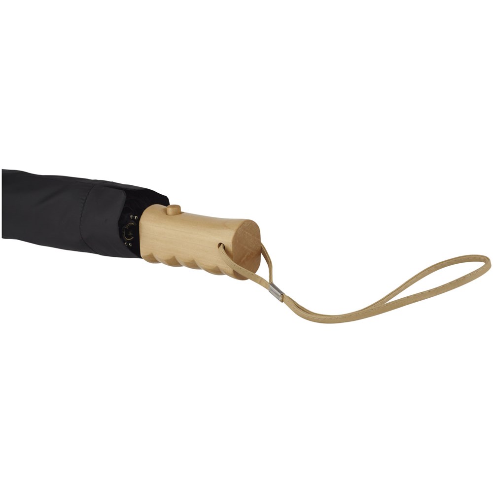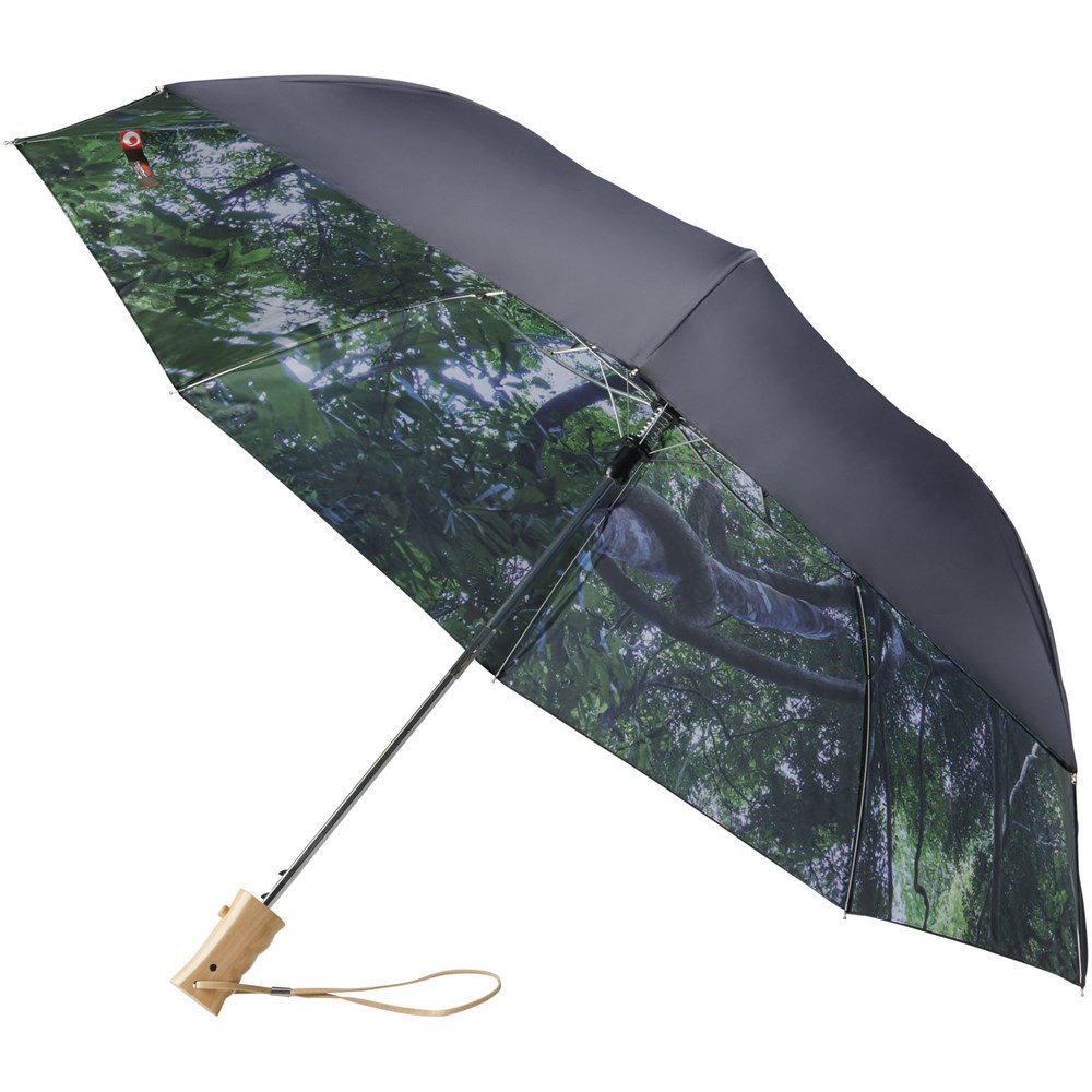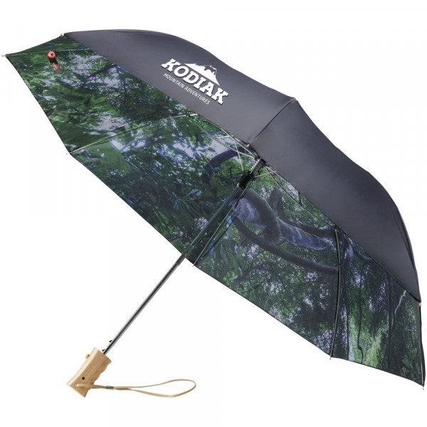 23 Zoll automatisch öffnender zweiteiliger zusammenklappbarer Regenschirm. Doppellagige Polyester-Plane mit passender Polyester-Tasche. Regenwald-Muster auf innerer Plane. Metallschaft und Holzgriff mit Handschlaufe.
