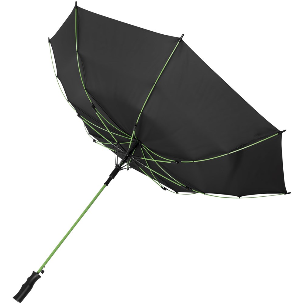23" Automatikschirm. Bespannung aus Polyesterseide und farblich passender Schutzhülle, farbiger Glasfaserschaft und Glasfaserspeichen. Farblich passende Naht am Schirm-Verschlussriemen. Windsicheres System. Exklusives Design.