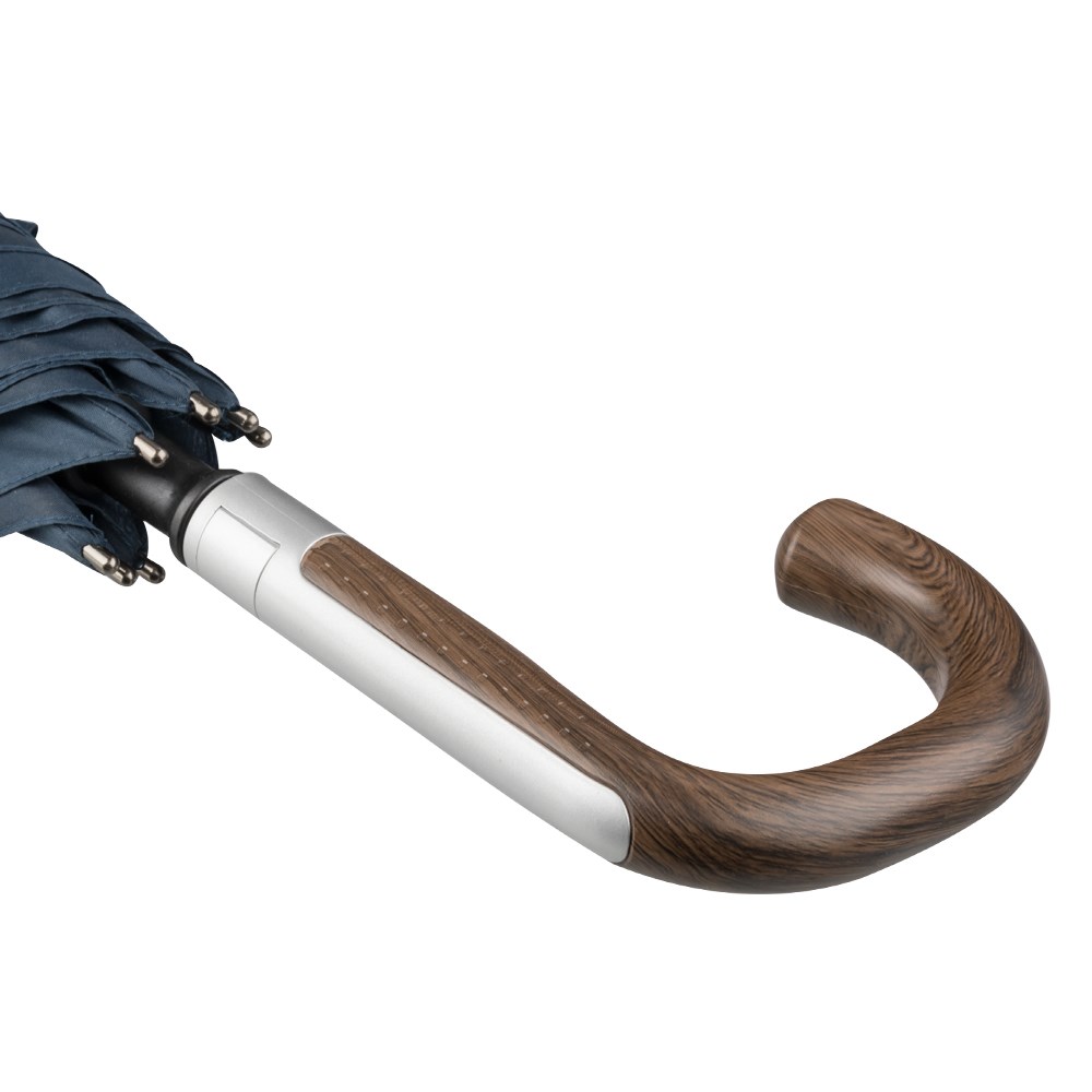 Golfschirm FENRIS - OKTAGON® - MIDsize - Automatik - Windproof-System Praktische Automatik zum leichten Öffnen - schwarzes, flexibles Fiberglasgestell mit reversiblen Fiberglasspeichen für eine hohe Belastbarkeit und Flexibilität bei stärkerem Wind - stabiler 14mm Aluminiumstock - exklusiver, gebogener Ergonomie-Rundhaken-Griff in Holz-Optik / aluminiumfarben - mit integrierter Automatik-Auslösetaste, Kunststoff-Kappe mit 'anti-slide' Gummi-Spitze in schwarz, 'gunmetal'-farbene Speichentips,- Polyester-Pongee-Bespannung mit schmutz- und wasserabweisender Hydrophob-Ausrüstung - komfortables Klettverschlussband - Speichenlänge ca. 70cm - Durchmesser ca. 120cm - Länge ca. 93cm - Gewicht ca. 565g