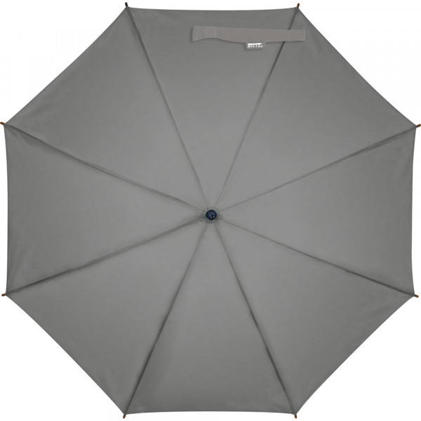 Hochwertiger Automatik-Regenschirm mit Fiberglasgestänge, Bespannung aus recycelten PET-Flaschen und gebogenem Holzgriff. Ihre Werbung wird auf ein Segment gedruckt.