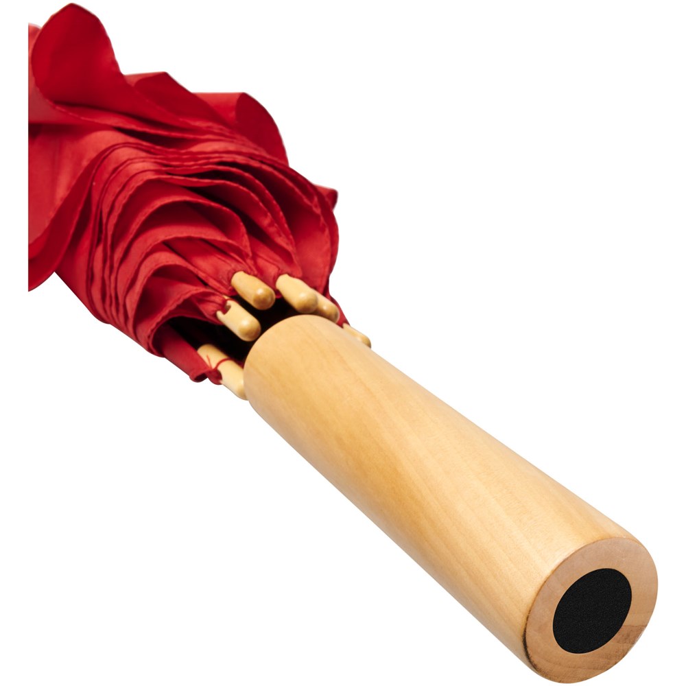 Automatikregenschirm mit Schirm aus recyceltem PET-Pongee-Polyester. Robuster Metallschaft und ein hochwertiger Rahmen mit Glasfaserrippen, der Flexibilität bei Wind bietet. Zusammen mit dem Holzgriff, den Spitzen und dem Schirm aus recyceltem PET-Pongee-Polyester bietet er eine nachhaltige Wahl. Erhältlich in vielen verschiedenen modernen Farben mit einer großen Dekorationsfläche auf jedem Paneel, der Holzgriff kann ebenfalls dekoriert werden.