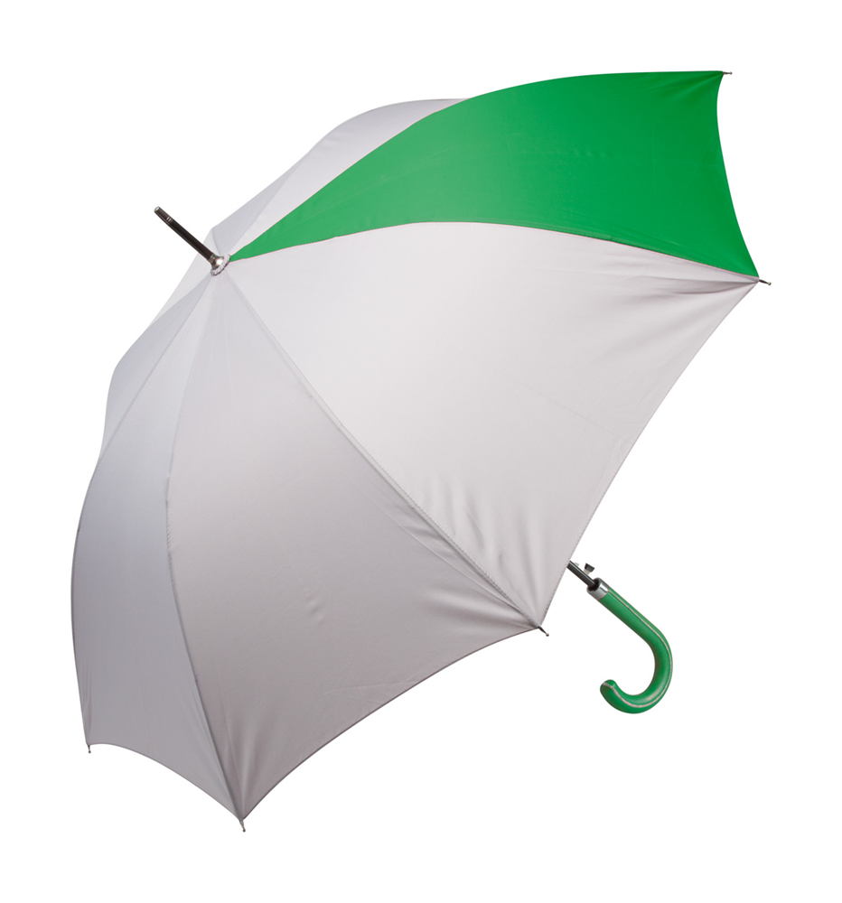 Automatischer Windproof-Stockschirm mit 8 Segmenten (eins davon farbig), Kunstleder-Griff, Metallrahmen und Fiberglass-Speichen. Material: 190T Pongee.
