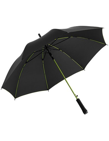 Komfortable Automatik-Funktion zum schnellen Öffnen | Windproof-Features für höhere Gestell-Flexibilität und bessere Windsicherheit | Flexible Fiberglasschienen | Stabiler Stahlstock mit farbiger Kunststoffummantelung | Polyester-Pongee Bezugsmaterial aus recycelten Kunststoffen, umweltfreundlich dank original waterSAVE Bezugsmaterial | Dezente Verzierung des Bezugs durch farbige Nähte | Soft-Touch-Griff mit Auslösetaste und Werbeanbringungsmöglichkeit