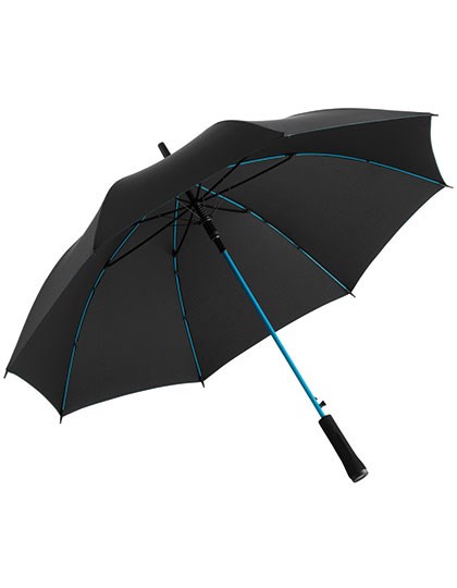 Komfortable Automatik-Funktion zum schnellen Öffnen | Windproof-Features für höhere Gestell-Flexibilität und bessere Windsicherheit | Flexible Fiberglasschienen | Stabiler Stahlstock mit farbiger Kunststoffummantelung | Polyester-Pongee Bezugsmaterial aus recycelten Kunststoffen, umweltfreundlich dank original waterSAVE Bezugsmaterial | Dezente Verzierung des Bezugs durch farbige Nähte | Soft-Touch-Griff mit Auslösetaste und Werbeanbringungsmöglichkeit