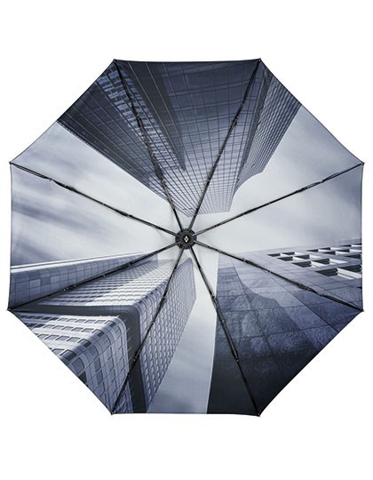 Komfortable Automatik-Funktion zum schnellen Öffnen | Hochwertiges Windproof-System für eine maximale Gestell-Flexibilität bei stärkeren Windböen | Verchromter Stahlstock | Von außen beschichteter Bezug mit Transferdruck innen | Soft-Touch-Griff mit erhabener Auslösetaste und Werbeanbringungsmöglichkeit | Griff aus Kunststoff
