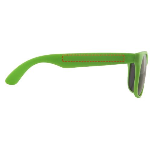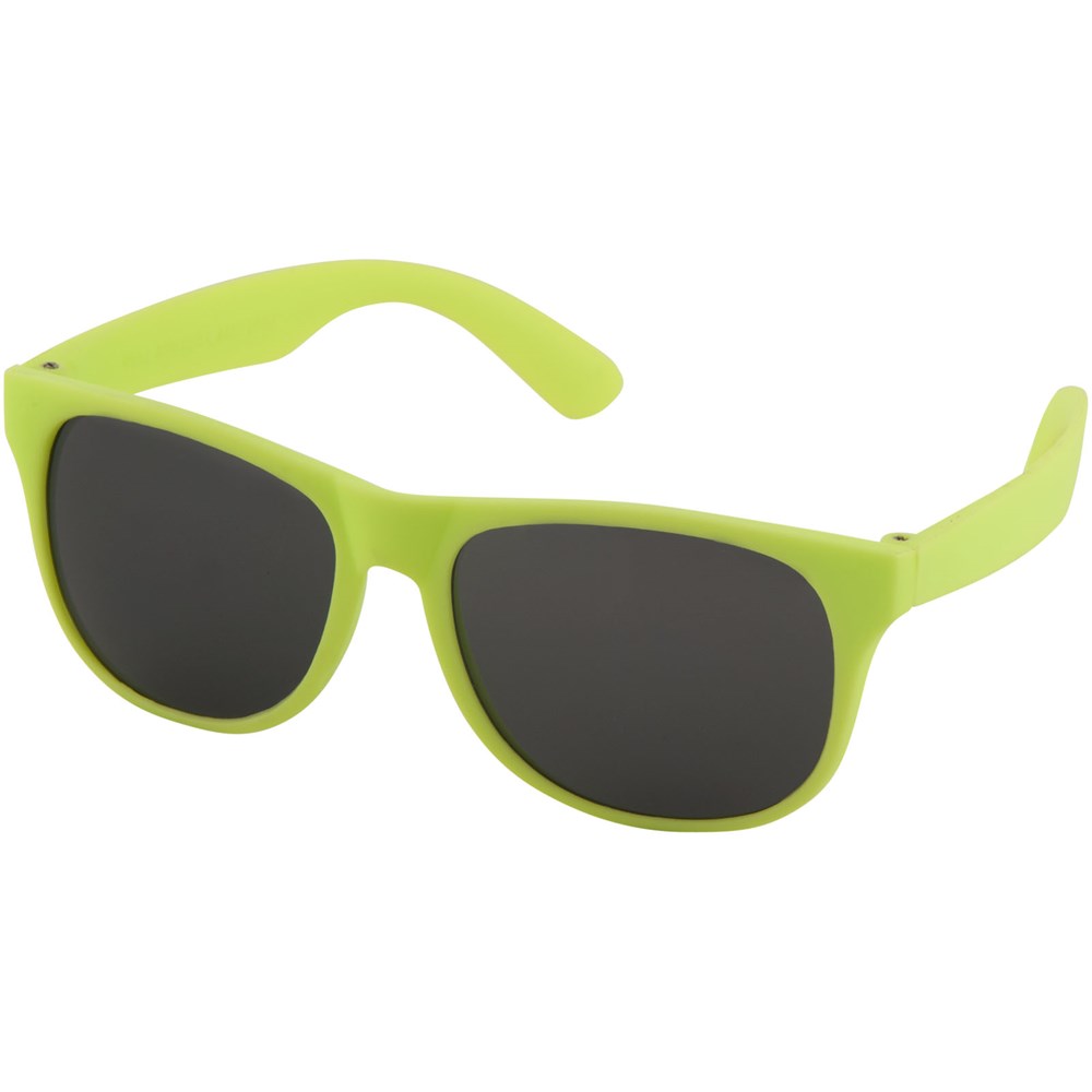 Sonnenbrille im Retro Design mit farbigem Gestell und schwarzen Gläsern der Kategorie 3. EN ISO 12312-1 und UV 400 konform.