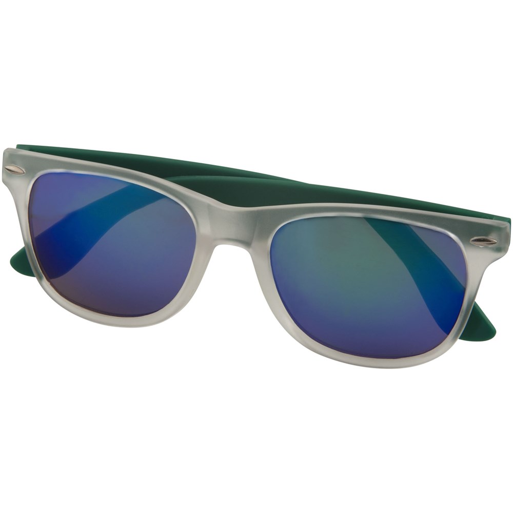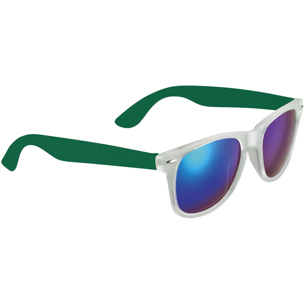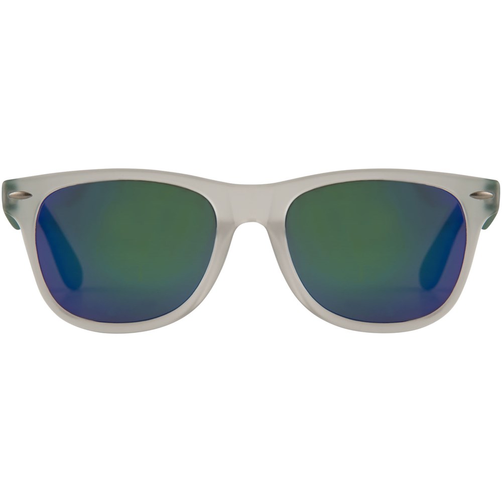 Sonnenbrille mit milchig weißem Rahmen, Kategorie 3 verspiegelte Gläser in 3 Farben und  farblich passender Bügel. EN ISO 12312-1 und UV400 konform.