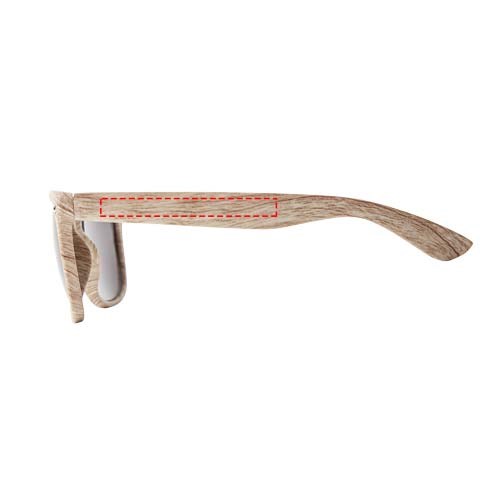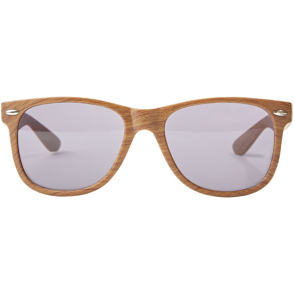 Sonnenbrille im Retro-Design mit holzartiger Oberfläche mit Gläsern der Kategorie 3. Erfüllt EN ISO 12312-1 und UV 400.