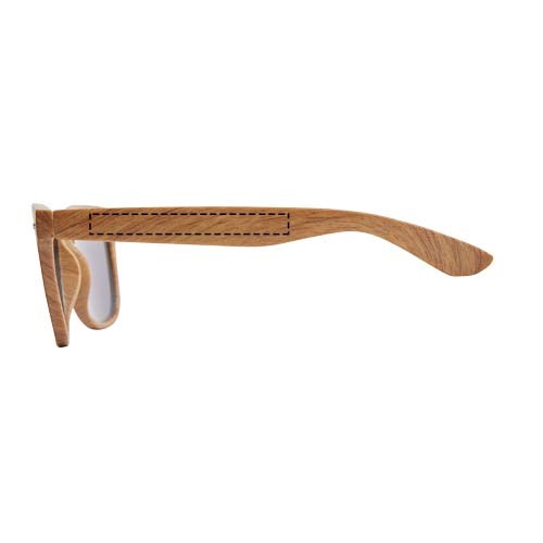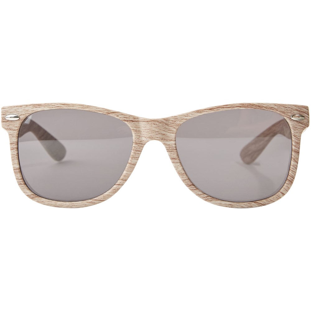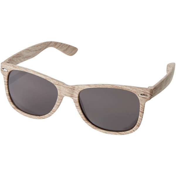 Sonnenbrille im Retro-Design mit holzartiger Oberfläche mit Gläsern der Kategorie 3. Erfüllt EN ISO 12312-1 und UV 400.
