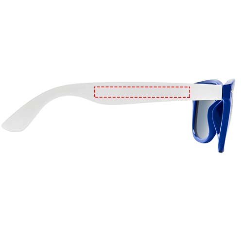 Sun Ray Sonnenbrille im Retro Design mit weißen Bügeln für viele Veredelungsmöglichkeiten. Erfüllt EN ISO 12312-1 und UV 400; die Gläser sind in Kategorie 3 eingestuft.