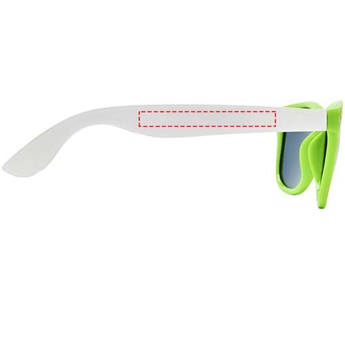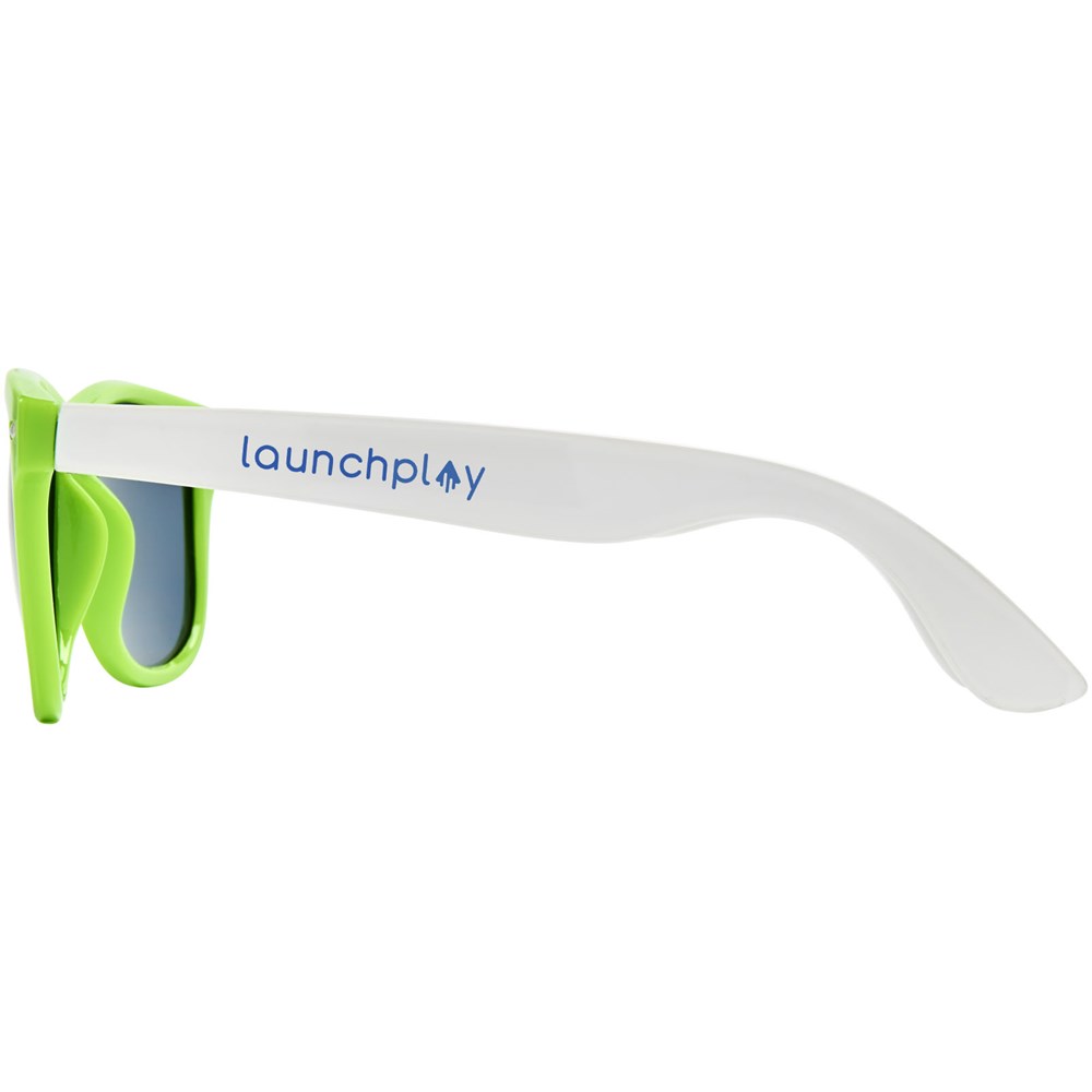 Sun Ray Sonnenbrille im Retro Design mit weißen Bügeln für viele Veredelungsmöglichkeiten. Erfüllt EN ISO 12312-1 und UV 400; die Gläser sind in Kategorie 3 eingestuft.