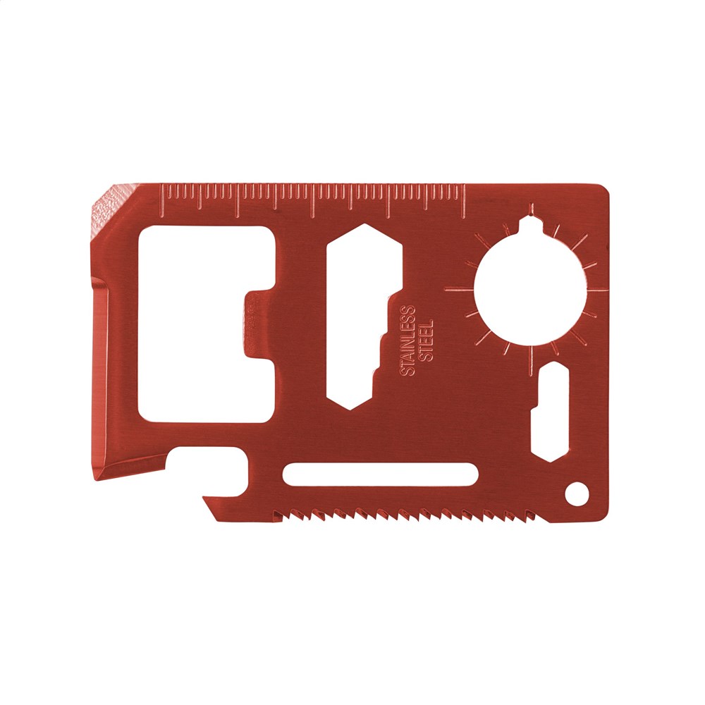 Multitool aus Edelstahl in Kreditkartenformat mit 11 Funktionen: Dosenöffner, Schraubenzieher, Lineal, Kapselheber, Schraubenschlüssel, Flügelzange, Säge, Winkelmesser, 2-seitiger Schraubenschlüssel und Schlüsselanhänger. In einem Etui aus Imitatleder. Inklusive Gebrauchsanweisung.