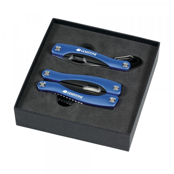 Geschenkset: 9-teilige Multizange aus Edelstahl mit 13 Funktionen und Taschenmesser aus Edelstahl mit Karabinerhaken und Arretierung. Beide mit Handgriff aus Aluminium in Metalliclook. Inkl. Nylonetui. Pro Set in einer Verpackung. Beachten Sie, dass möglicherweise lokale Vorschriften für den Besitz und / oder das Tragen von Messern oder Multitools in der Öffentlichkeit gelten.
