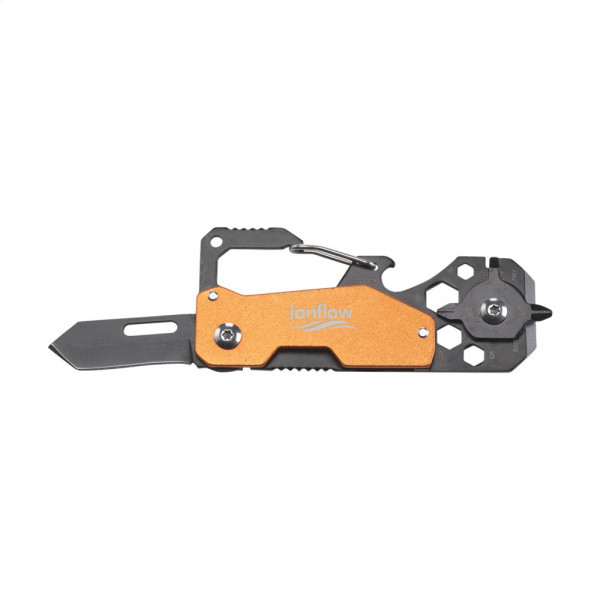 Multitool aus rostfreiem Edelstahl in praktischem Taschenformat. In Metalloptik und 8 Funktionen: Speichenschlüssel, Flaschenöffner, Karabinerhaken, Kreuzschraubenzieher, Schraubenschlüssel, Messer, Lineal und Brecheisen. Beachten Sie, dass möglicherweise lokale Vorschriften für den Besitz und / oder das Tragen von Messern oder Multitools in der Öffentlichkeit gelten.