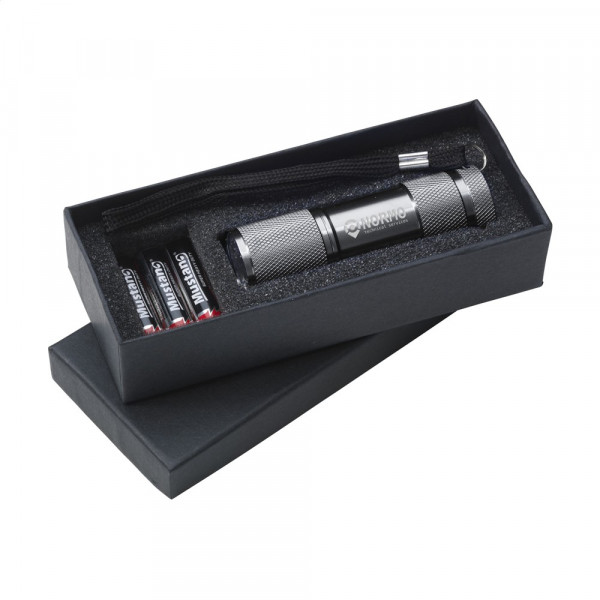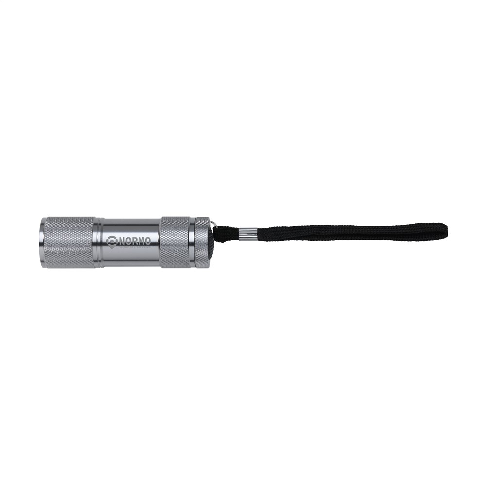 Aluminium-Stablampe mit 9 hellweißen, energiesparenden LED-Lampen und abnehmbarer Schlaufe. Maße: Ø 2,7 x 9 cm. Inkl. Batterien. Pro Stück in einer Verpackung.