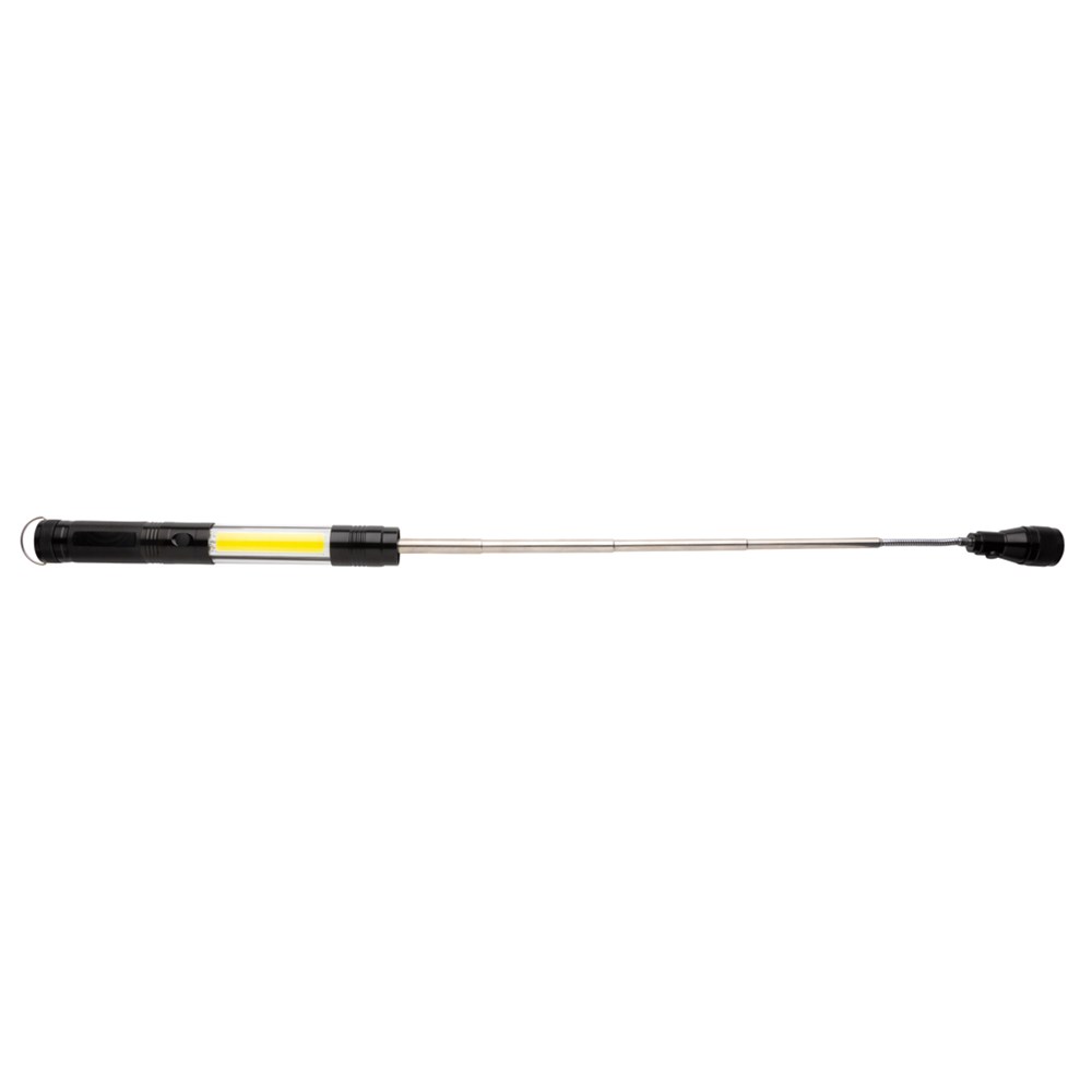 Die perfekte Arbeitsleuchte für alle Fälle. Mit dem Magnet auf der einen Seite findet sie Halt an allen magnetischen Oberflächen und mit der ausziehbaren Aluminium Lampe (26-64cm) an deren Ende sich ein weiterer Magnet befindet, beleuchten Sie nicht nur schwer einsehbare Stellen, Sie fischen auch Schrauben o.Ä. aus den entlegensten Ecken. Die Taschenlampe hat 3 LED 10 Lumen und die COB Leuchte 80 Lumen. Ebenso ist der Kopf der Taschenlampe, wenn sie ausgezogen ist, flexibel und kann so in alle Richtungen gedreht werden. Inklusive Batterien