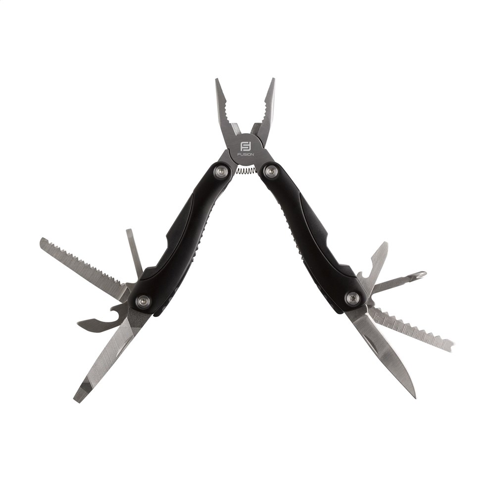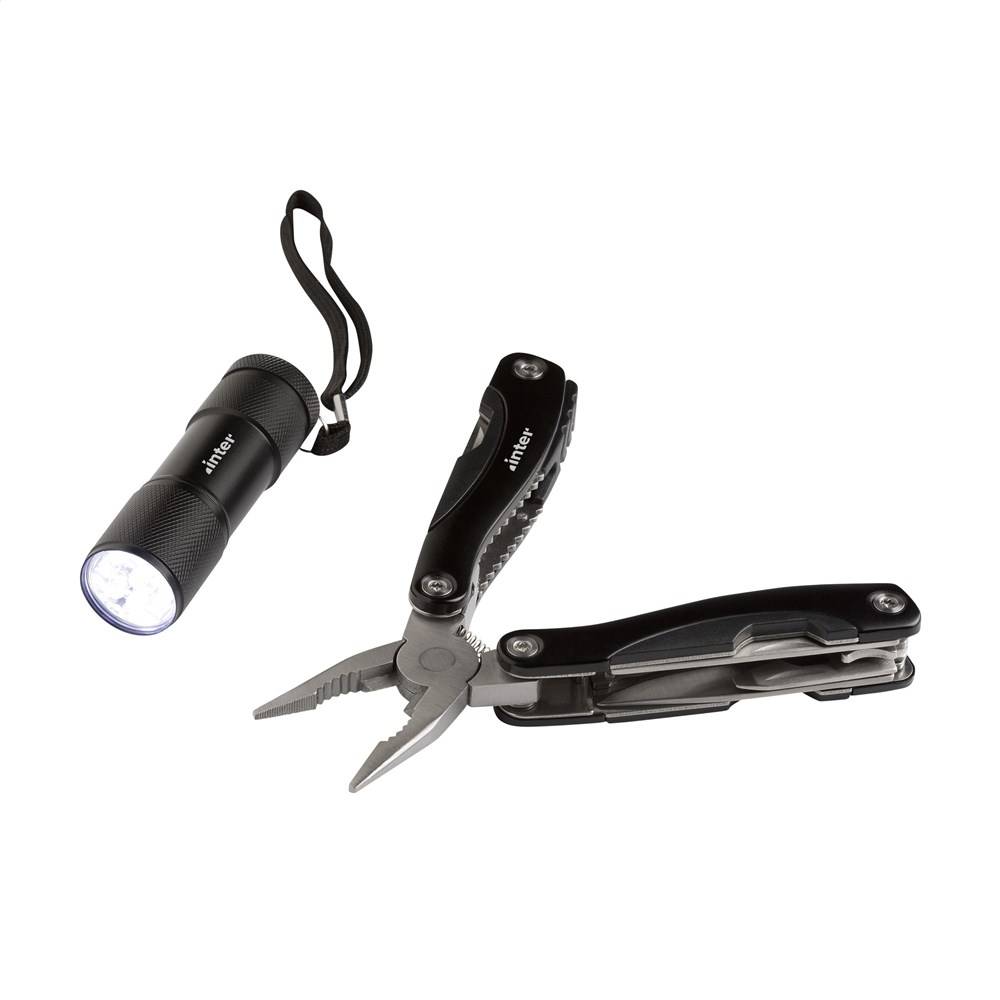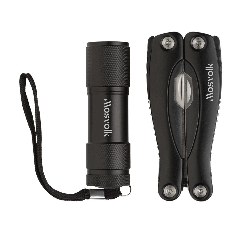 Geschenkset: • 9-teiliges Edelstahl Multitool mit 13 Funktionen und Aluminiumgriff in Metalloptik. Aluminium Taschenlampe (Ø 2,7 x 9 cm) mit 9 rein-weißen energieeffizienten LEDs und abnehmbarer Schlaufe. Inklusive Batterien. Jedes Set in einer Box.