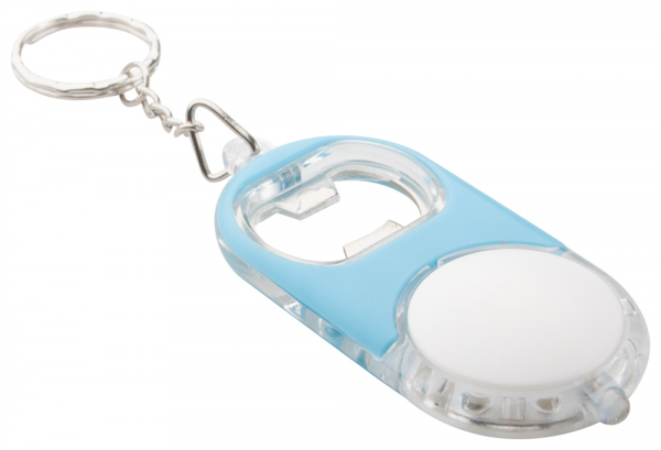Flaschenöffner aus Kunststoff mit weißem LED-Licht und Metall-Schlüsselring. Inkl. Knopfzellenbatterie.