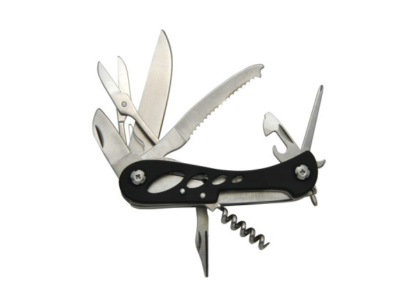 2CR13 Stahl und gummierter Aluminiumgriff. 12 Funktionen: Messer mit Sicherheitssperre, Kurze Klinge, Säge, Flaschenöffner, Schere, kreuzförmiger Schraubenzieher, Scheibenzertrümmerer, Dosenöffner mit Blockierungssystem, Schraubenzieher, Korkenzieher, Einfädelhilfe, Befestigungsring. Lieferung in Kartonbox.