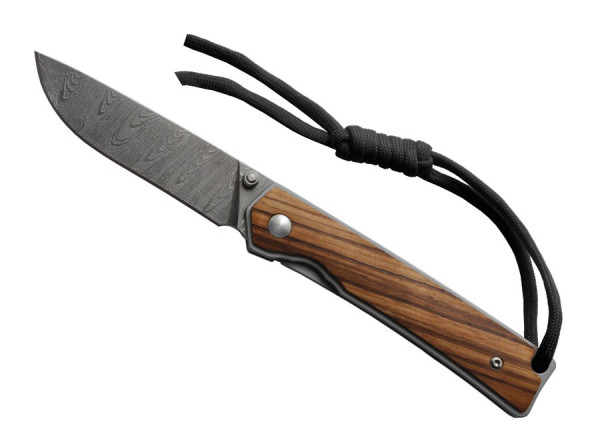 Klappbares Messer. Klinge aus Edelstahl in Damast-Optik. Griff aus Eschenholz. Sicherheitssperre vom Typ Liner Lock. Öffnen/Schließen mit einer Hand. Schwarze Kordel.