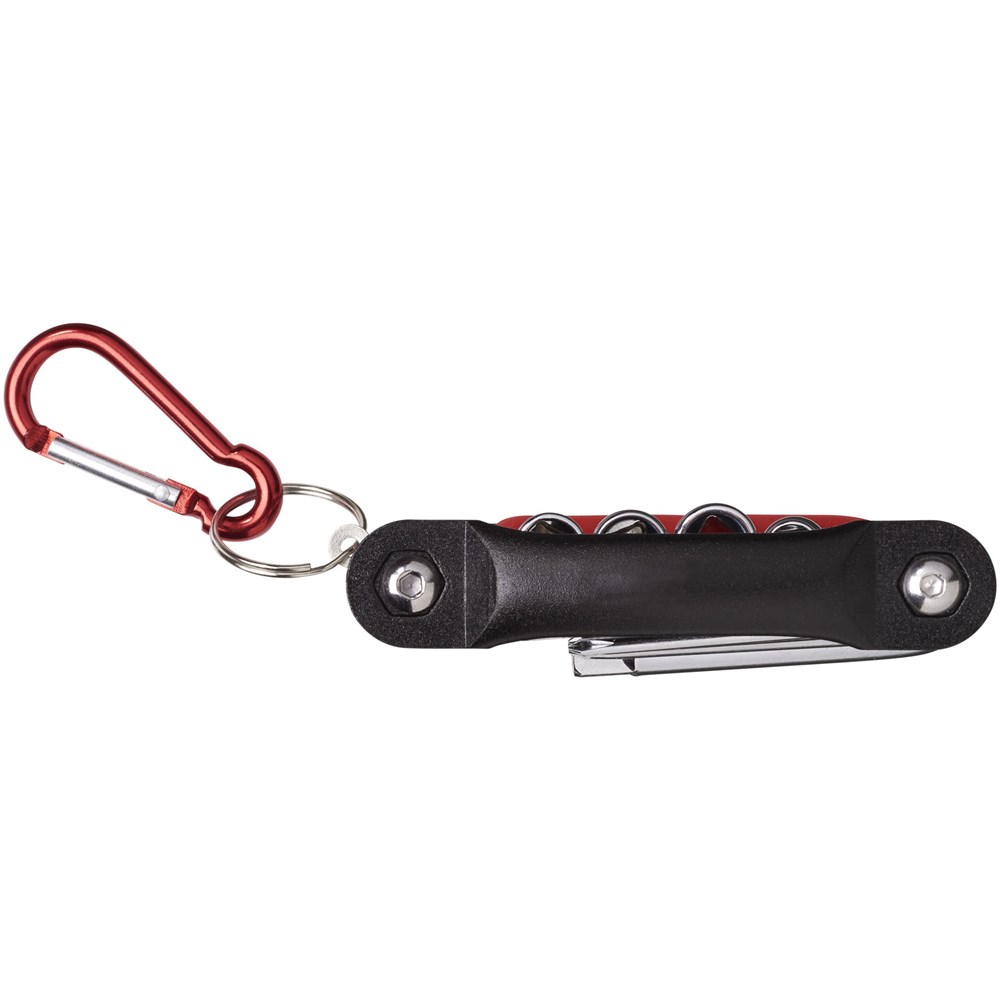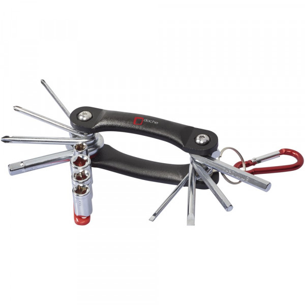 Multifunktionswerkzeug mit 12 Funktionen. 3 Kreuz- und 2 Flachschraubendreher, 2 Sechskantschlüssel aus Karbon-Stahl mit Chrom-Überzug. Inkl. farbigem Adapter mit 4 Fassungen und farblich passendem Karabiner (nicht zum Klettern geeignet).