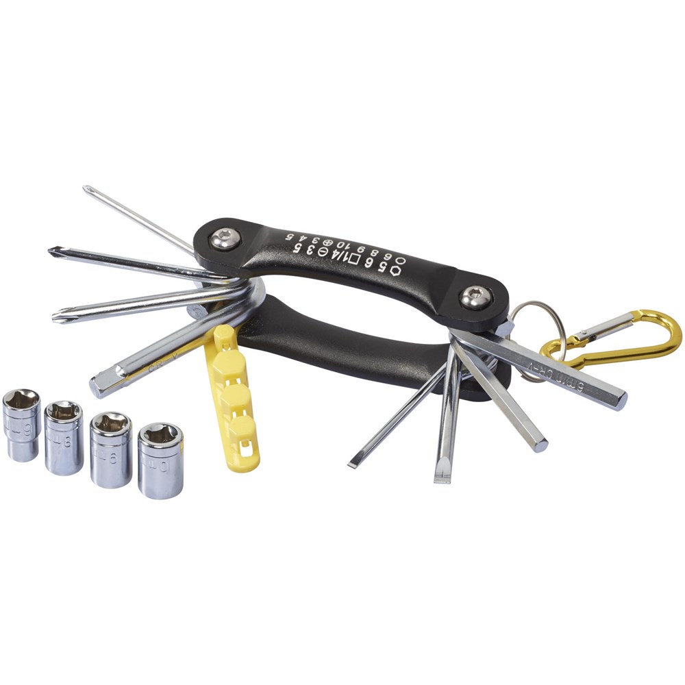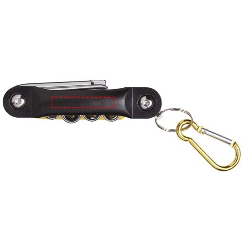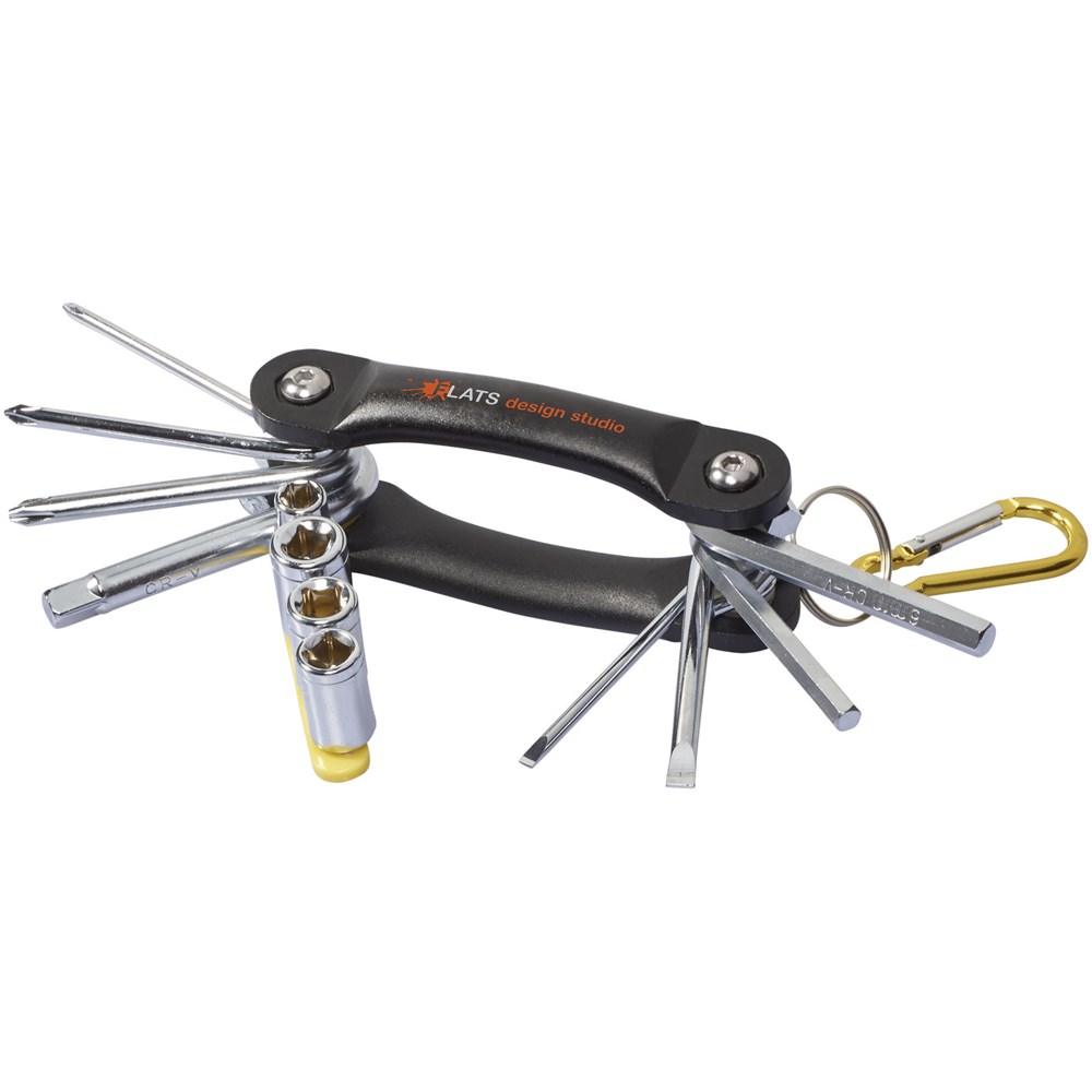 Multifunktionswerkzeug mit 12 Funktionen. 3 Kreuz- und 2 Flachschraubendreher, 2 Sechskantschlüssel aus Karbon-Stahl mit Chrom-Überzug. Inkl. farbigem Adapter mit 4 Fassungen und farblich passendem Karabiner (nicht zum Klettern geeignet).