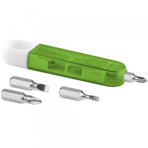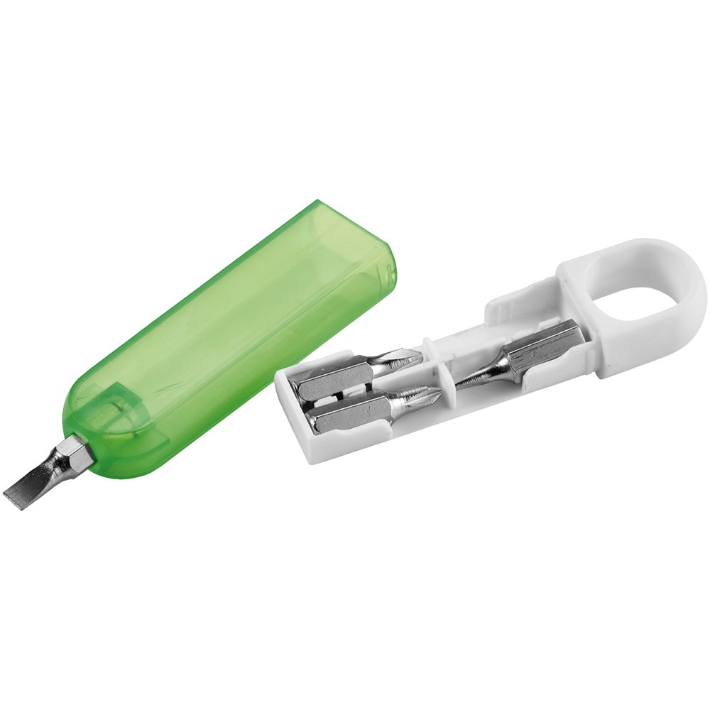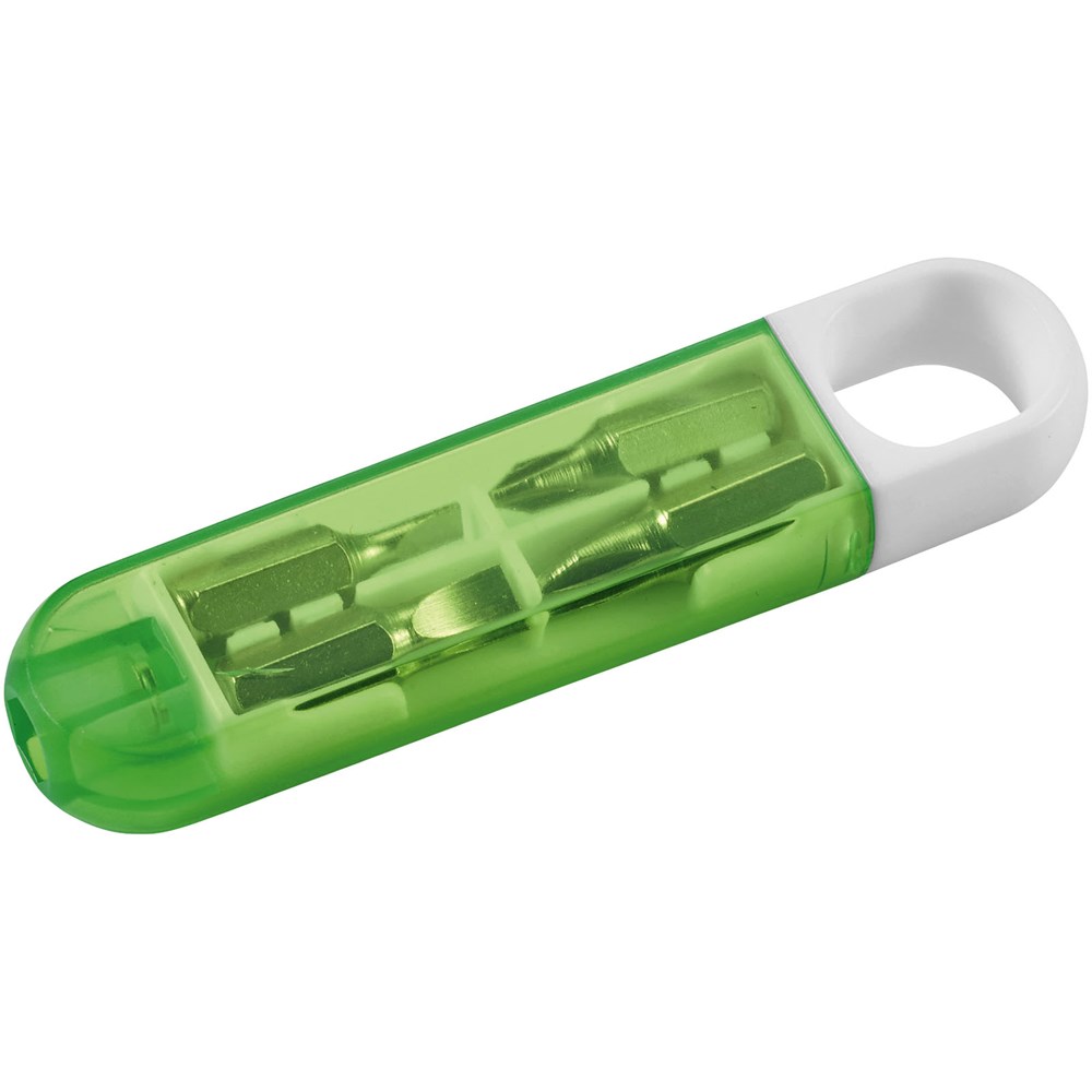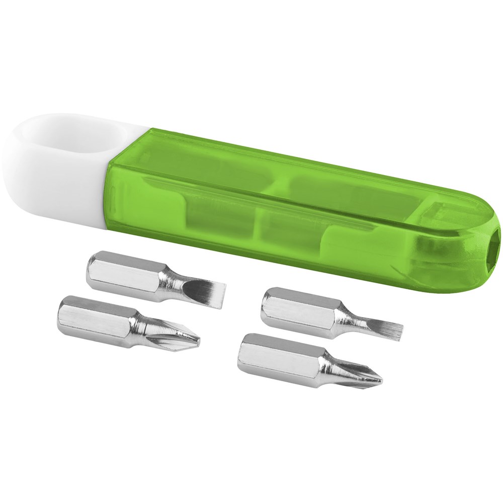 Fach zum Herausschieben enthält jeweils Schlitz-Schraubbits und Kreuzschlitz-Schraubbits in 2 Größen. Magnetische Basis hält die Bits für die Verwendung bereit.