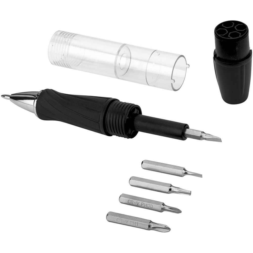 Stift mit Drehmechanismus in der Spitze, abschraubbarem Schaft mit magnetischem Bit Halter inkl. 5 Bits und drehbarer LED Lampe oben. Inkl. Batterien.