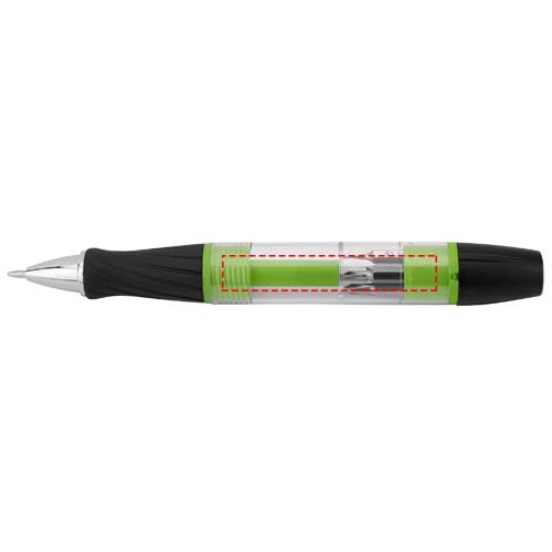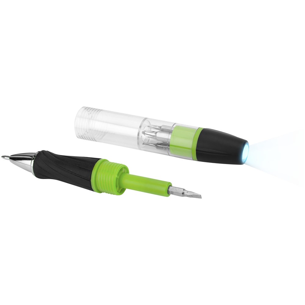 Stift mit Drehmechanismus in der Spitze, abschraubbarem Schaft mit magnetischem Bit Halter inkl. 5 Bits und drehbarer LED Lampe oben. Inkl. Batterien.