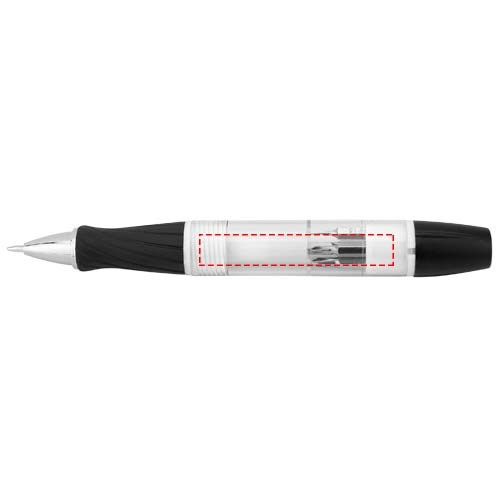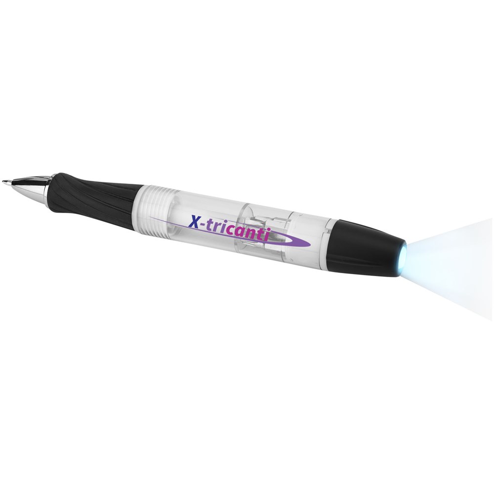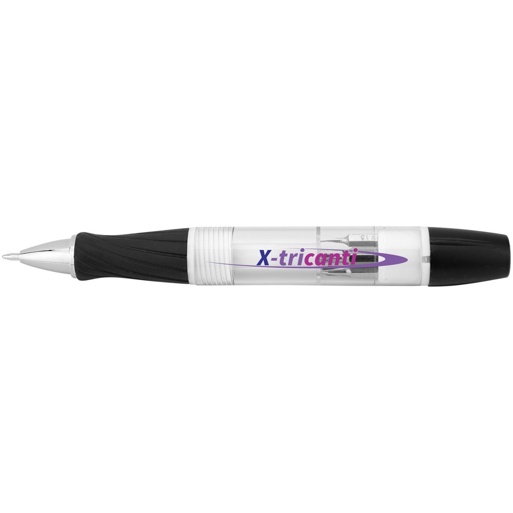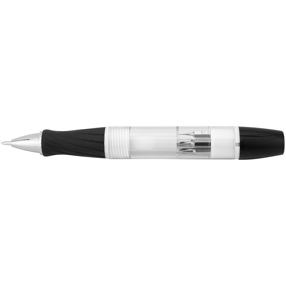 Stift mit Drehmechanismus in der Spitze, abschraubbarem Schaft mit magnetischem Bit Halter inkl. 5 Bits und drehbarer LED Lampe oben. Inkl. Batterien.