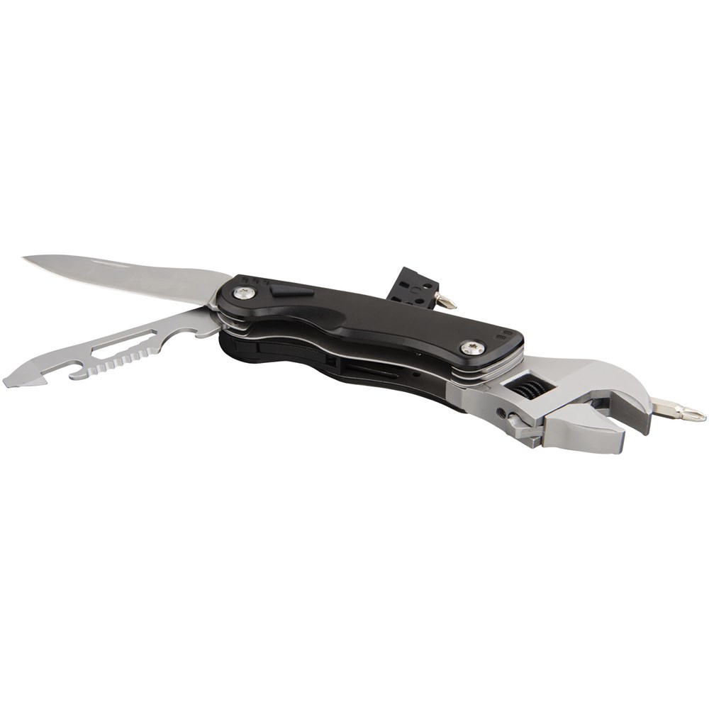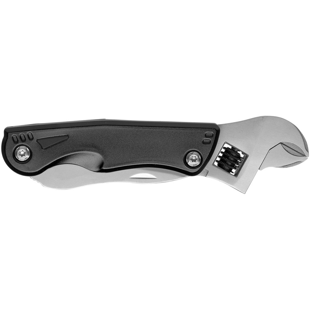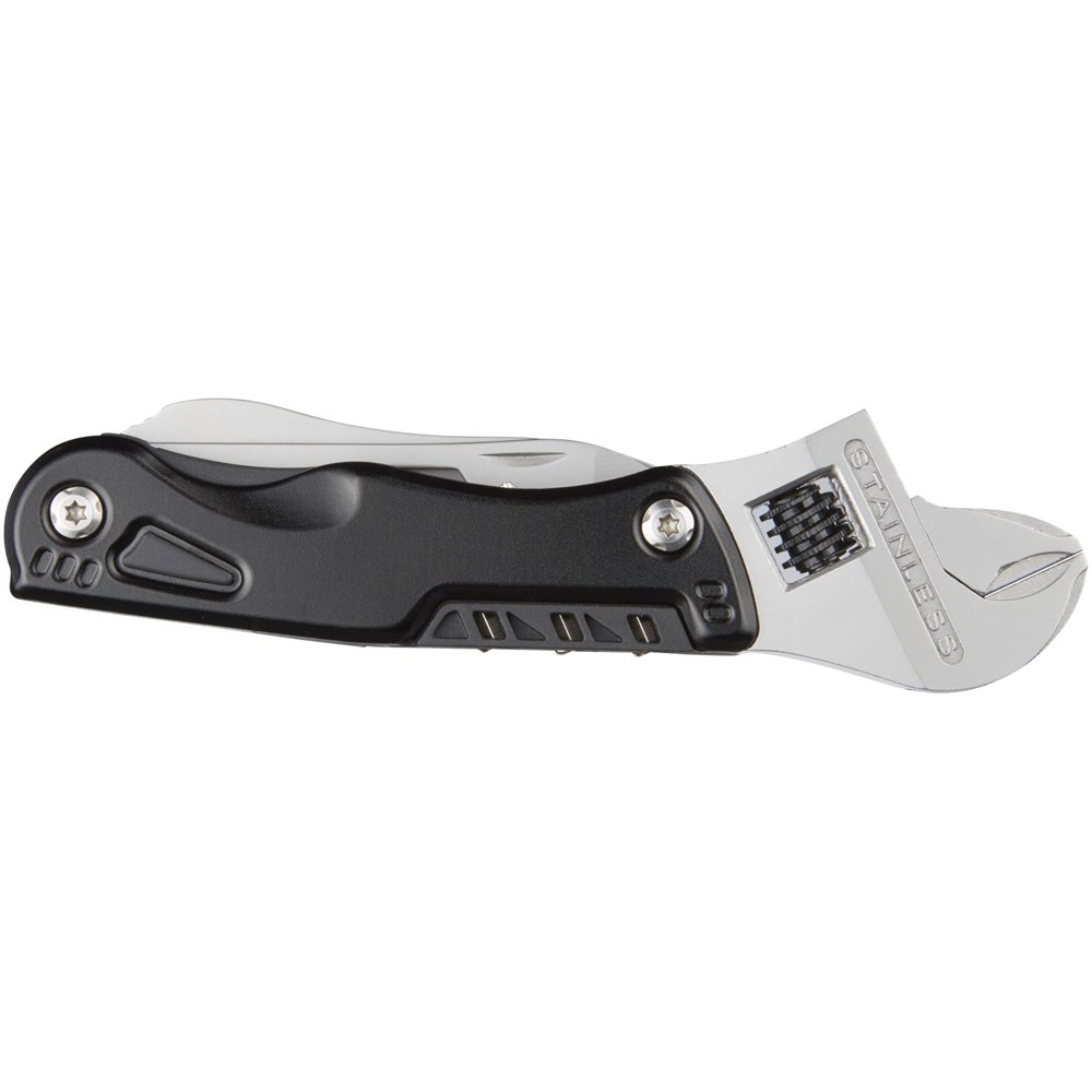 Multifunktionswerkzeug im kompakten Design mit verstellbarem Schraubenschlüssel und LED Licht, ideal für schnelle Reparaturen. Verfügt auch über einen Schlitzschraubendreher inkl. 3 Schraubendreherbits, Messer, Säge, Dosen- und Flaschenöffner. Verpackt in einer STAC Geschenkverpackung.