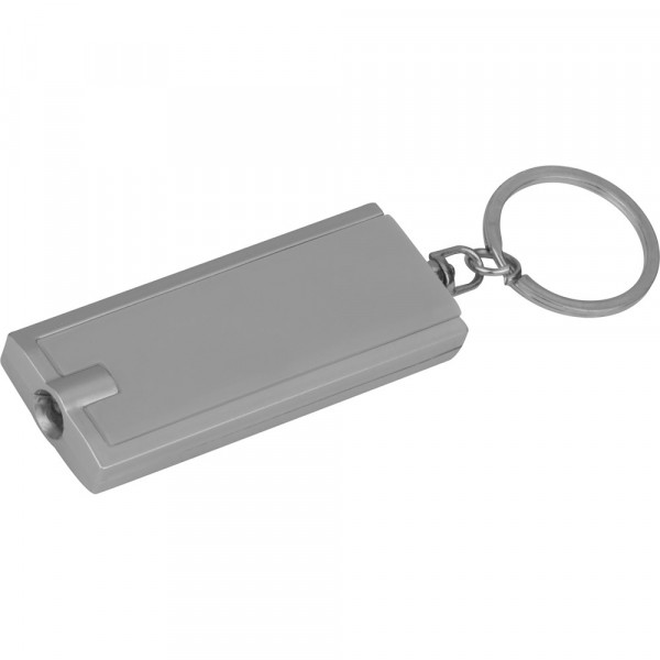 Flacher, rechteckiger Schlüsselanhänger mit integriertem, weißem LED Lämpchen. Die freie Fläche ohne Druckknopf bietet genügend Platz für Ihren Werbedruck.
