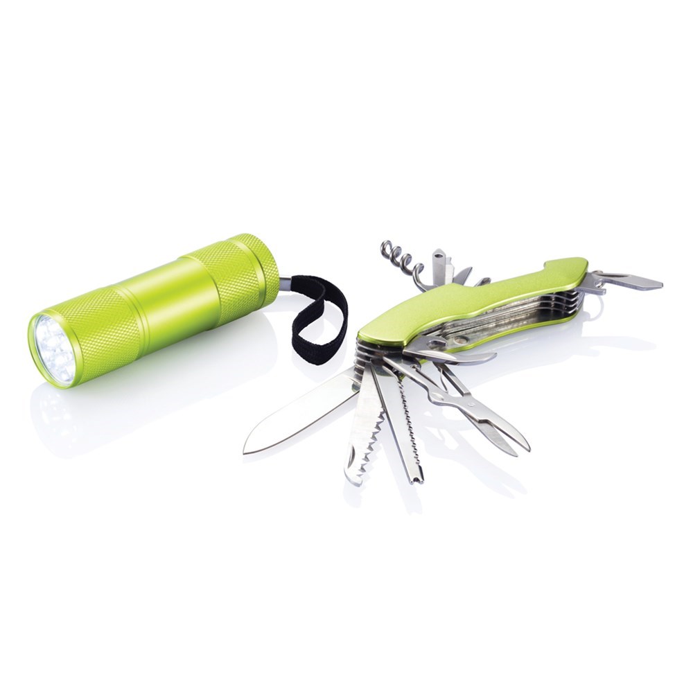 Set inkl. Taschenmesser aus eloxiertem Aluminium, 13 Funktionen, Quattro Taschenlampe aus eloxiertem Aluminium mit 9 LED, konfektioniert in Geschenkbox mit Magnetverschluss. Inklusive Batterien.