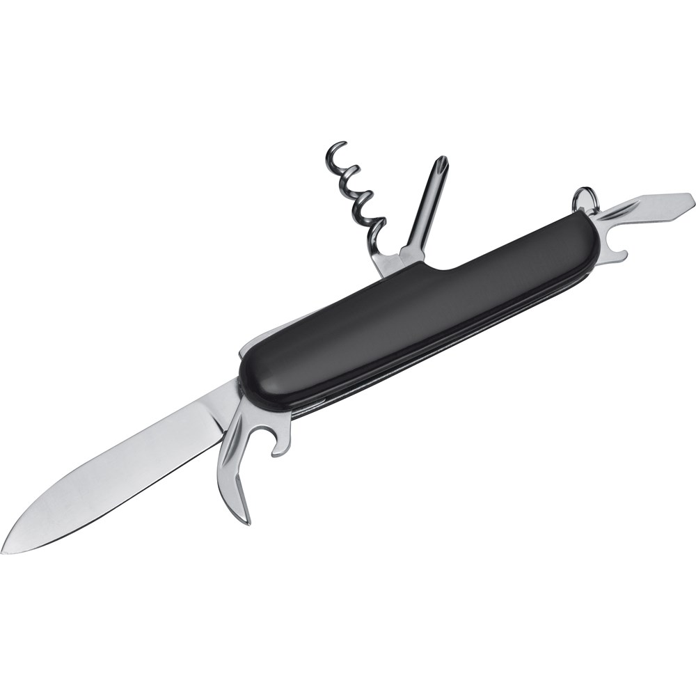Edles 7-teiliges Aluminium-Taschenmesser mit großer Klinge, Dosen- und Flaschenöffner, Korkenzieher, Kreuz- und Schlitzschraubendreher und Schlüsselring. Ihre Werbung lasern wir mittig auf die Metallic-Lackierung.