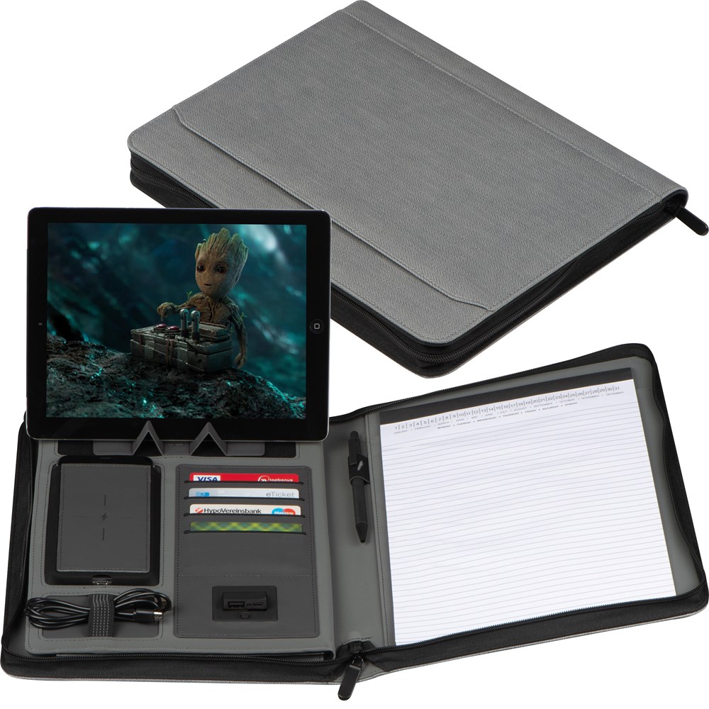 Schreibmappe aus Kunstleder mit integrierter Powerbank (5.000 mAh), USB-Ladekabel, Wireless Charger, Kugelschreiberschlaufe, diversen Steckfächern, Tablet- und Smartphonehalterung und Schreibblock. Die Werbung wird außen auf die Mappe gedruckt.