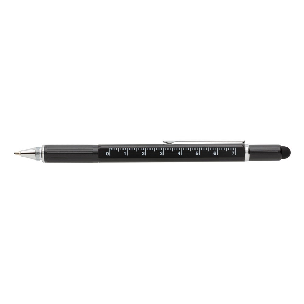 Multifunktionsstift - 400m blauschreibend - mit Skalierung ( 7cm), Wasserwaage, Schraubendreher, Stylus-Spitze. Aus Messing mit Aluminiumclip.